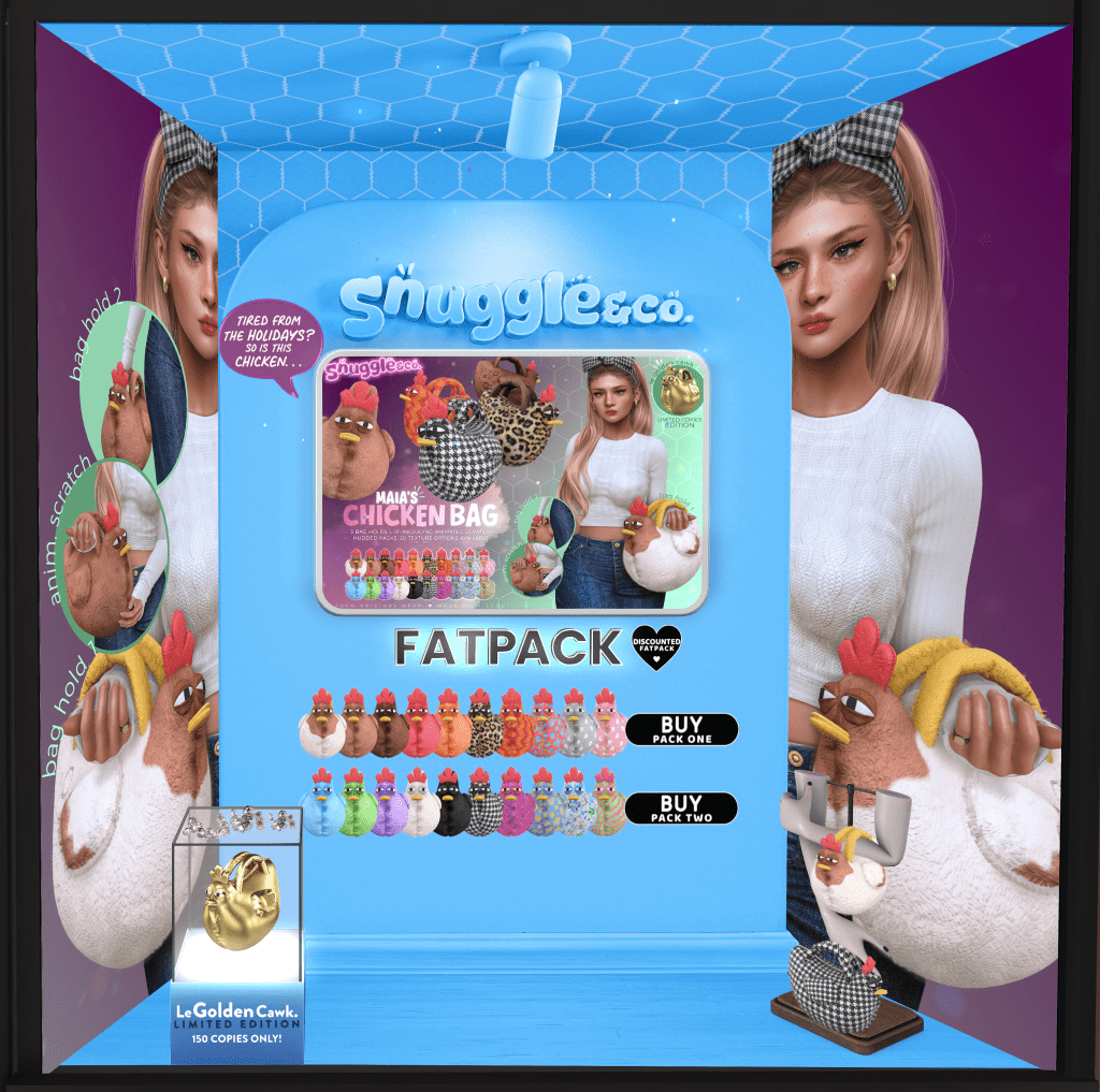 According to the creators, SNUGGLE & CO this is ‘Maia’s Chicken Bag’but it sodding well isn’t. It’s mine. And I bloody love it, in fact I love all of them, aren’t they sensational? There are 149 of the golden chicken bags left and I heartily suggest you go and check them out when KUSTOM9 opens at 12AM SLT on January 15th.