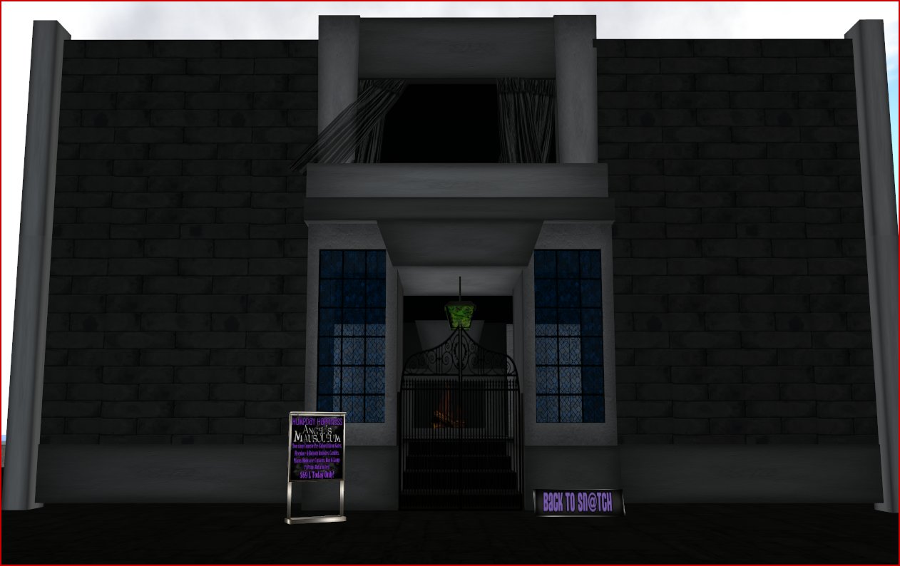 The structure is two-story dwelling with a balcony. Nothing remarkable there, but it starts to evoke a Necropolictic ( I don’t *think* that’s a word, but it works so shush) air as soon as you walk toward it. There are a pair of faboosh metal-swing gates that open outwards towards you, and they’re so evocative that in my Kitty-mental head I can hear them spooky-squeaking as they move..I kid you not!! Yes, I make my own sound effects people…anyway, moving on… Above your head as you walk in hangs an Absinthe green gas light, and as you mount the steps you’re overcome with a feeling of…ok, enough of the Edgar Allen Poe. When you walk in you’re directly opposite a fireplace. Nothing fancy here but prime for decorating with your skulls and candles and zombie brains in jars.