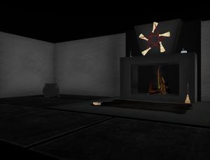 Interior shot of the downstairs featuring the fireplace..I’ve splashed some Witchy around..