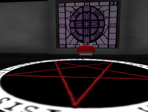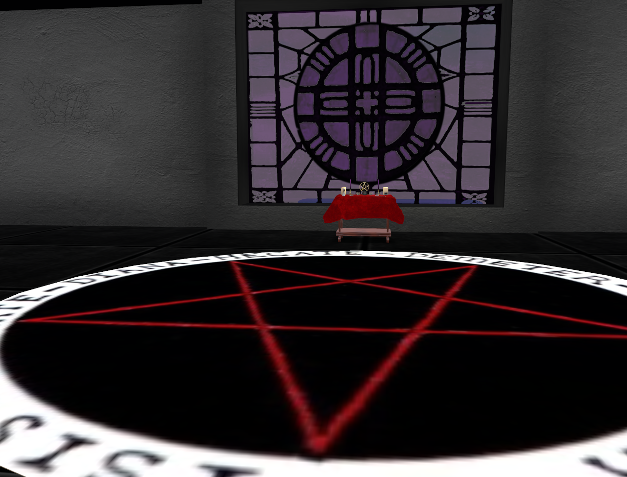 You get my drift huh? There are logs crackling and spitting in the hearth ( there goes my mental again, making sound effects up!) and it’s got a load of potential to make into a really special focal point in the room. In fact, the space around you is AMPLE for whatever needs you may have, and Ivey has even supplied a one-prim bookcase to start you off decorating the place a bit. There’s a bearskin rug included too, perfect for laying in front of the fire as you read a grimoire by candlelight..again, a candle has been provided in the total package by Ivey, BUT all these items are optional, you don’t have to use them. Considerate, eh? One thing that I really do rate are the choice of textures that Ivey has deployed in the interior. I love the cracked-plaster effect upon the walls and although Gothically inclined the build is not so dark as to make the space seem plain and boring. She’s made really effective choices for the window texture too..I love it. For the price she could have gotten away with just black walls but she didn’t. Kudos to Ivey for that. Moving upstairs takes you into another large open space. There are two features here that really made me *wow* First up is the stained glass window which felt as though it came out of a Depeche Mode video circa ‘Songs Of Faith And Devotion’ ( If you’re a DM fan you’ll get EXACTLY what I mean, in fact with that in mind it would make a great hangout for a DM fan..hang some pictures of Dave up on the walls..you get the drift) The second is the large window opening out onto a balcony. Ivey has provided some black curtains for you to hang here and they’re super effective and atmospheric as they drift in the breeze.