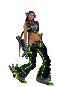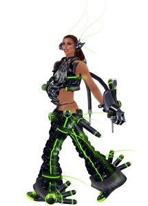 Let’s backtrack a little. I have blogged Jinx before; she creates amazing cyberwear and I was nothing short of amazed the last time I reviewed her productions. But, if it’s even possible, she’s excelled herself yet again with this ‘Legacy’ cyber/clubwear set. It’s so named due to the spectacular neon lighting effects that adorn the elements of this outfit, lighting that is heavily reminiscent of ‘Tron’ the sequel to which is called ‘Legacy’. Get it? Jinx couldn’t have come up with a more appropriate name had she tried, but this outfit is so much more than a homage to a yet-to-be released movie.