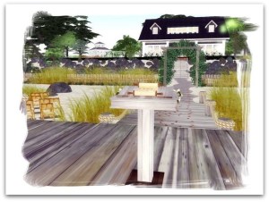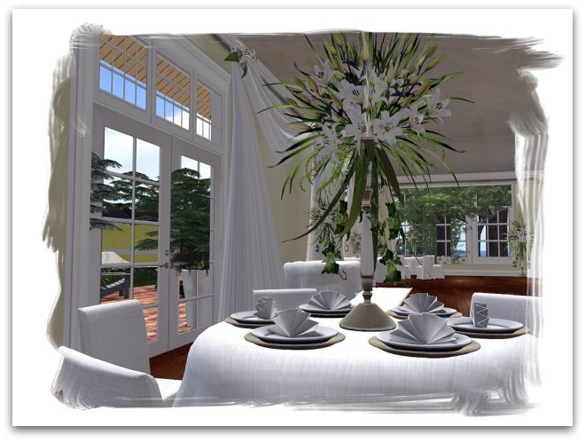 Just like in real life, receptions in Second Life either make or break a wedding. All too often the memories of the stunning service are clouded by cringeworthy thoughts of the cheesy venue festooned with pose balls and all kinds of Second Life unsightliness that you don’t need to make an appearance in your wedding album. Fortunately there are no worries here; with the reception being held in a cottage style structure that is textured in muted shades and decorated with panache. The lilies that were featured on the chairs outside are here in abundance adorning tables and stands around the room, which is decorated with soft lighting and cool, crisp white linen. This is evidently a silver service event, and one that is sure to be talked about by all those who were lucky enough to attend for months to come.