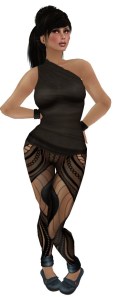 What DOES work beautifully though are the Xander leggings. These are fabness, inspired by an item from Alexander Mcqueen’s collection. They look completely funky and work perfectly with short dresses, shorts and boots or just wearing on their own and being ever so slightly outrageous. London, the designer, states that these are hand drawn. Kudos then for such great pattern work and style. If you can create awesome leggings like these, then fixing the dodgy edging on the Ling top won’t be a problem at all. The ‘leggins’ ( as London refers to them) are available in black, white and pink and I think are a very worthwhile addition to your virtual wardrobe indeed. Stylish and funky, just what SL fashion is all about.