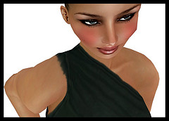 The top is a one shoulder affair, and to me the part that goes over the shoulder is ever so slightly too wide..it doesn’t ‘sit’ comfortably on me, in fact it’s almost into my neck. It looks uncomfortable. I dunno about you but when I wear an item of clothing in SL I often go so far as to ‘imagine’ the fit and the feel, and alas, this one doesn’t look right. It would cut into my neck for sure. Sadly it’s also let down by some seriously fuzzy edge issues on the side of the shoulder strap too- there is a slight scalloping to the edges of the top, but on the front, just going over the shoulder it goes completely awry and looks pretty rough. It spoils the whole top, as the image below shows: