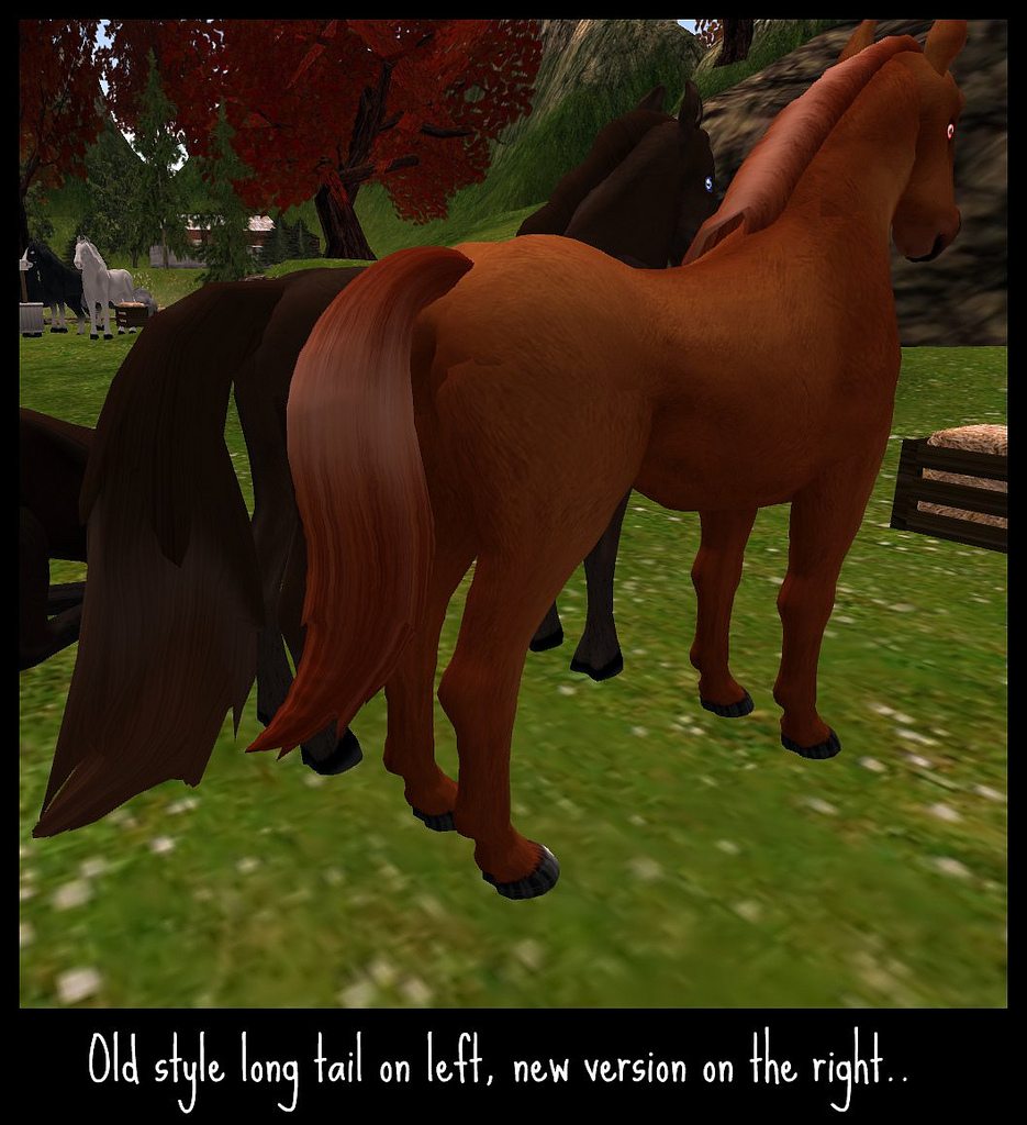 For a start the horses seem to have lost the overall roundness that they once had. In fact, this is most extreme on the faces, where the once gentle curves have become replaced by a more angular aspect. There is more detail on the mane, this is seen to great effect in the upright mane which granted, looks much better. As does the tail, which has much more depth and detail than it did before. This is shown to great effect on long tails, although I didn’t see much change to the long mane which was disappointing. It would have been nice to see random curls or waves there. The eye textures and colours are slightly altered as well. Personally I think the eyes have lost their character and have become beady, a trait I observed and commented about when I first saw the Amaretto breedable dogs.. The colours and textures are tweaked somewhat as well. In some instances it works, in others I’m not so sure. For instance, teh Red Walkers I’m featuring in this post were a nice shade of red-brown, now they’re almost orange!