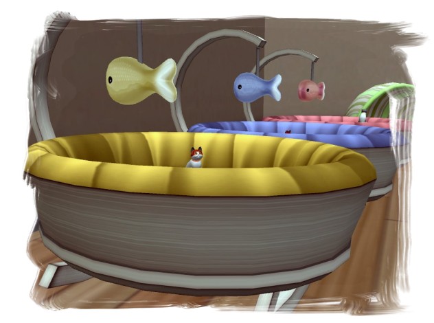 Now this one is purrfect (see what I did there?) for you if you are a total ‘cat-mommy’. The Kittycats mainstore is offering a rather sweet Kitty Rocker Basinette. At L$175 for 10 prims it reeks of cuteness and should you own one, I demand that you fill it to bursting with kittens and take photos! It is, as you would expect, beautifully coloured and textured but then again I haven’t seen anything in the Kittycats store yet that has suffered from bad texture choices or faulty design. It’s all good and let’s be be honest very feminine, but who cares? This is Second Life and you can overdose on the girly if you want:) The Kitty Rocker Basinette comes in 6 muted shades to coordinate with pretty much any home, although nekos who live in dustbins may find it doesn’t quite work. Incidentally the store has TONS of wonderful beds and scratching posts if the basinette ain’t your thing, and every single one is a corker. Barnesworth Anubis has contributed a few beds and items to the collection himself and they are definitely worth a looksy. You know, I wish you could get this stuff in real life. Instead my lot prefer their beds dank and dingy. I have such chavvy cats!)
