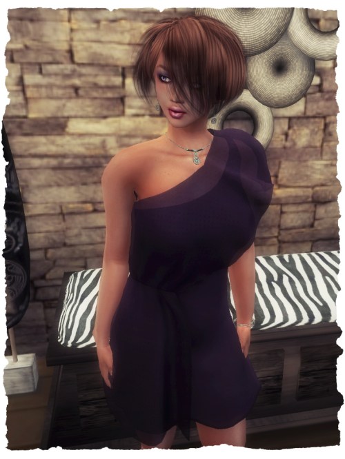 So with that out of the way, feel free to salivate over this frock that I’m wearing. It’s called ‘London’ and it’s in plum too, my favourite colour. ISN’T IT GRAND?! It’s actually deceptively simple; it’s a plain shift embellished with a gauze that features a delicate dot-print. It’s over one shoulder too, making it totally on trend and perfect for partying. (It’s the kind of dress in real life that I’d wear to a wedding reception; except alas I couldn’t wear it in real life because I’d look like an elephant with thrombosis. Thank God for SL!)