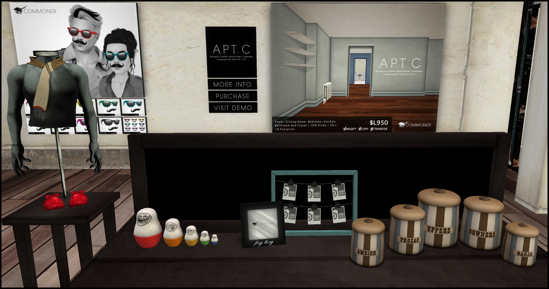 So apart from FLF goodness, what else will you find? Well, I have a new house, so I need home ware right? And nothing, NOTHING is more appropriate for me than this collection of ‘Vice Jars’, featuring an array of vices that Judy Garland would be proud of. I love the twisted aspect of these, and they really look the part (Why not gift these as a house-warming present to someone you love, hate, or just want to annoy? They cost L$150). Also prides of place in my home are the Rage Face Nesting Dolls. I unashamedly adore internet memes so these were a must have for me. (They cost L$150). If you’re a smoker then you may find the cigarette-styled scarf appealing. It is very original and looks really funky, so I might buy it for my Dad to wear seeing as he likes filling his lungs full of crud. (Non-smoker here, can’t you tell?) The scarf is $175.