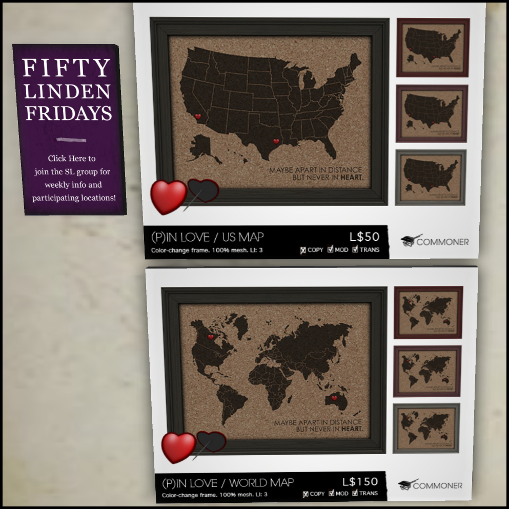OK – onto the good stuff. And it is indeed good stuff. First up, I MUST tell you about today’s Fifty Linden Friday option, because it’s inspired. It’s simple yet very effective, poignant even. A lot of people in Second Life are partnered to, or in relationships with Avatars that are some distance away from each other. Often this is in RL, not just Second, so this map with love heart push-pins will really resonate. There are two options: USA or The World. I love it. Fortunately for me, or unfortunately depending upon the mood that I am in, I share the same abode with both my RL and SL partner so I don’t really have need for this item. But I think both are absolutely gorgeous, and would make an especially brilliant Valentine’s gift (more on those later). Of course, each map is L$50.