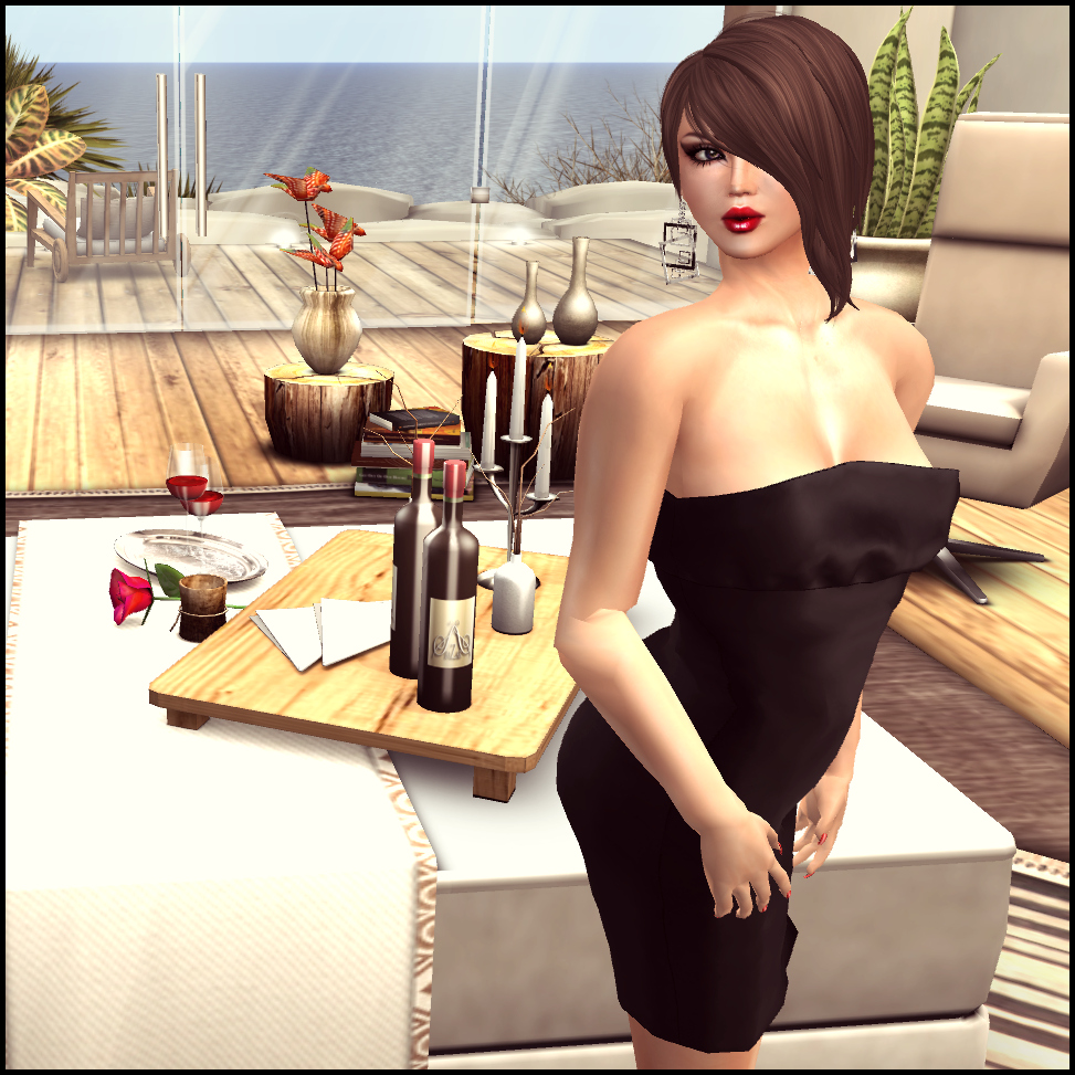 My other choices from Ricielli’s Valentine’s Hunt are dresses, and the first frock I selected is a rather refined example of the quintessential black dress. You can never have too many little black dresses in your inventory in my opinion. This one is number 12  and it’s is deceptively simple. It’s short and sleeveless with a subtly stylised band over the bust.   This kind of dress looks fabulous with short hair and statement jewellery.  I didn’t have a necklace in my inventory that I felt would do it justice, so I left my flesh bare, but I really think something large and expensive should be worn around your neck to truly compliment this mesh marvel.