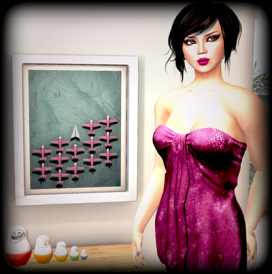 But it’s not over yet.  When you’re doing the hunt be sure to pick up the little box behind heart number 11. It costs L$10 and is an item I presume from another hunt, but again it contains a lovely short dress festooned in magenta sequins. This would also be a winner for a Valentines date, as you can see below!