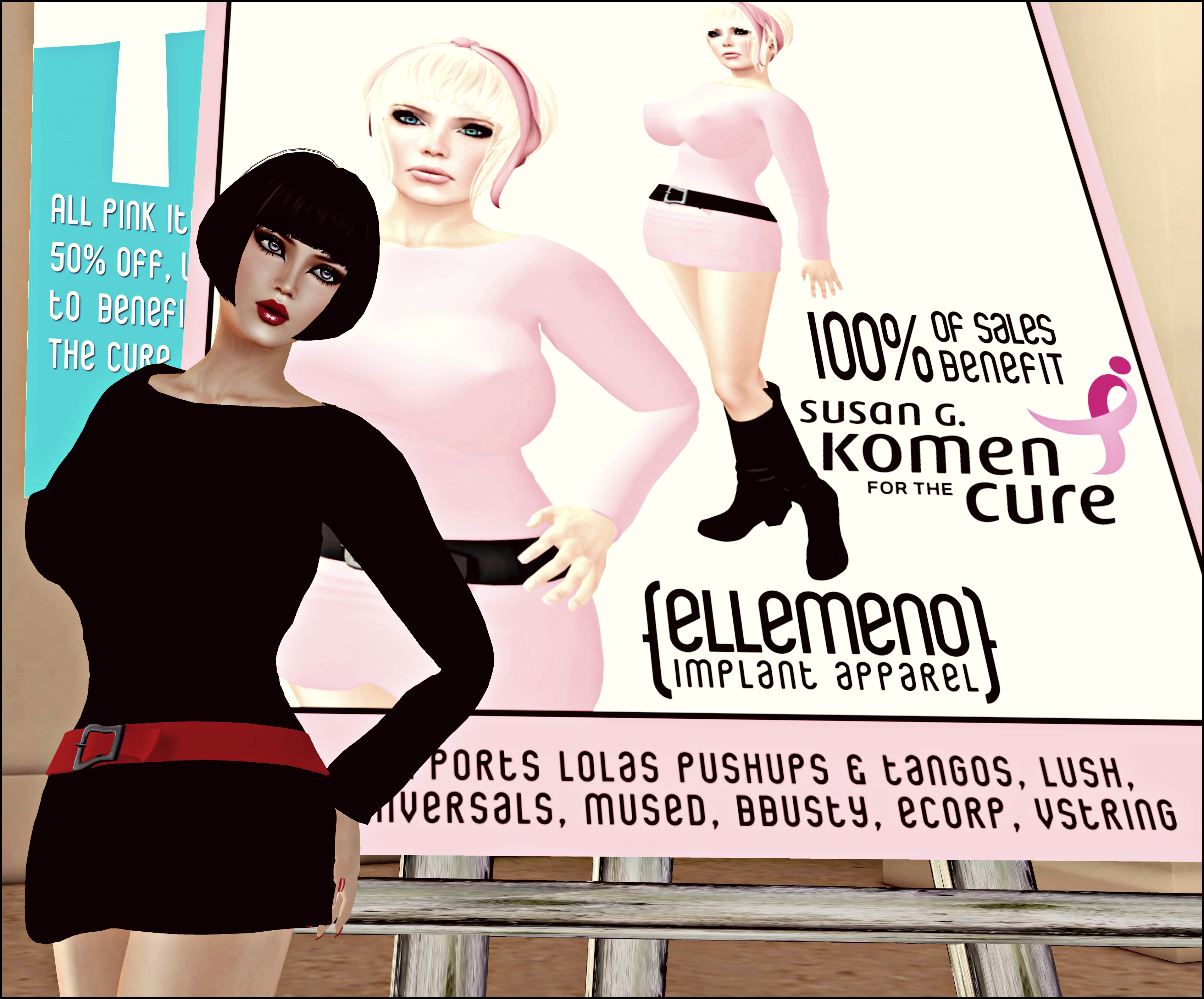 So what kinds of goodies await you? Well, first of all let me tell you about this classic little black dress that I’m wearing. It’s actually a hunt prize, can you believe it? Nope, I couldn’t either. A simple style with a contrast belt making it bang on trend, and it was free as part of the ’Hunt For Your Inner Slut’, ahem.   It’s also mesh! I was so chuffed, I teamed it a classic black bob courtesy of Elikatira ( last few days for that that sale guys, don’t forget!) and had a look Anna Wintour herself would be proud of! Incidentally I’m stood next to the pink version which is rather special as all the proceeds from the sale of this dress will go to the Susan G. Komen For The Cure Breast Cancer Foundation. It costs L$250 and is well worth investing in.