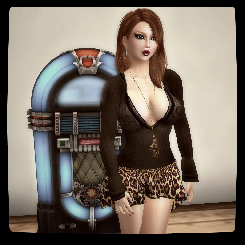So what do you think? I hope you like both these looks as much as I do, and I am certainly having fun wearing them. And speaking of fun, see the jukebox that I’m standing in front of? Isn’t it bloody glorious!  It’s from ‘The Stuff Store’, and the stuff that they sell is rather special indeed!  I first discovered them when I decided to buy Dad something nice for his new pad. I thought a juke box would be ideal to finish off the bar area against his home, so I did a search on the marketplace and found ‘The Juke’. This mesh creation evokes a golden era, as does most of the other retro ‘stuff’ in Crias Rowlands’ eclectic store.  It comes in both Modern and Retro versions, is mesh and weighs in at just 8 prims, which is astonishing when you consider the detail. It serves as a land radio featuring 80 stations, so there should be music available to suit every taste, and something I really like is the fluorescent tubing on the front of the unit which, when switched on, creates the perfect ambience.  It really is a stunning, substantial piece of kit and really turns your house into a home.