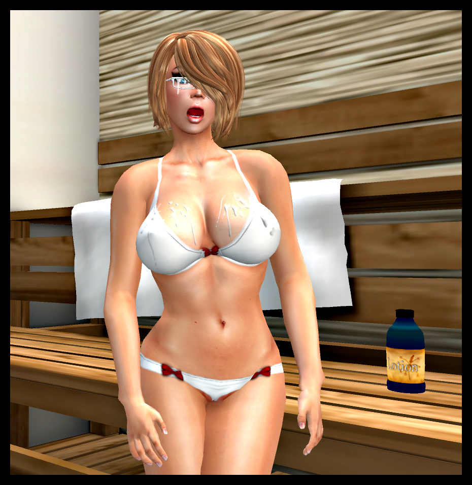 What’s going on in the picture? Well, isn’t it obvious?! Kitty had an ‘accident ‘in the sauna when she was applying her ‘lotion’. (She was trying to do it carefully because she didn’t want to get the hose again) and as you can see clumsy Kitty spilled it all over her glasses and her frontage! (And there you were thinking it was something smutty! For shame!) What kind of a Kitty do you think I am? (No, don’t answer that question!)
