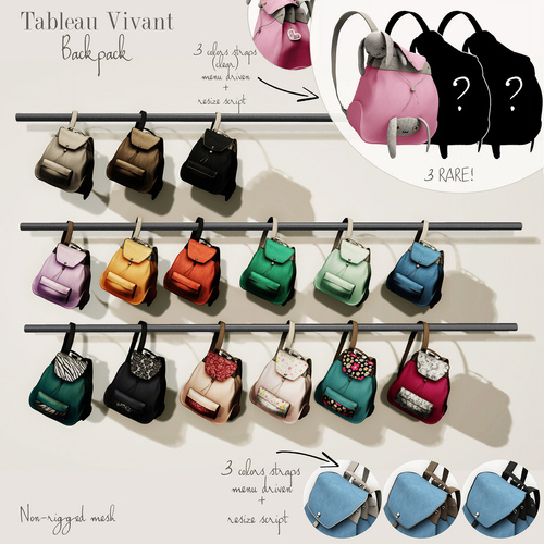 TABLEAU VIVANT have two fantastic Gachas this round. First up are some back-packs. I don’t often wear bags in Second Life, but these would change my mind. They look great, are non-rigged mesh and feature resize scripts too for a perfect fit. Not only that but I’m intrigued by the three rare items in this Gacha, because two of them are surprises. We can see that one of them is a bunny back-pack which looks unbelievably squeesome, but the other two are shaded out so you can’t see what they are. It’ll cost you L$75 each time you try to find out. Worth a shot? It’s one of the more pricey Gacha items, but in my opinion more than worth it.