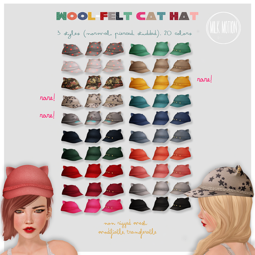 Well, I’ll definitely be having a shot at winning some of the rare Wool Felt Cat Hats from MILK MOTION. There are *gulp* 60 to win, but I have my eye on the starry cap; it looks rather swish, don’t you think? I’m pretty sure this is going to be a hugely popular gacha item, and is just L$50 a go.