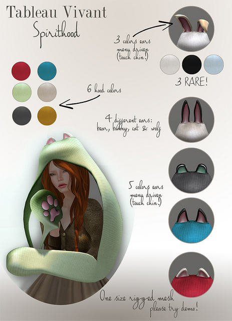 And so is the Spirit Hood available from TABLEAU VIVANT’s second gacha in the event; this features a virtual version of those animal hoods with mittens built in that everyone was wearing around Christmas (yes, I’ve got one in real life, shush) Judging by the picture this looks to be quite a promising item, BUT it’s one-size rigged mesh so I recommend that you try a demo before parting with your L$75. If the demo fits, then there are 27 to win. Fingers crossed the demo fits me then!