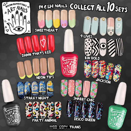 NYLON OUTFITTERS have an ‘Art Nails’ mesh nails Gacha at the event and you can win one of ten sets of nails. It doesn’t say on the poster if any of them are rarer than others, but I certainly have my eyes fixed on the ‘9 Lives’ and ‘Party animal’ set. At L$50 a try I’ll be keeping my fingers crossed for some luck on this one; they’re rather fancy aren’t they? I love the quirky presentation and styling of these so much!