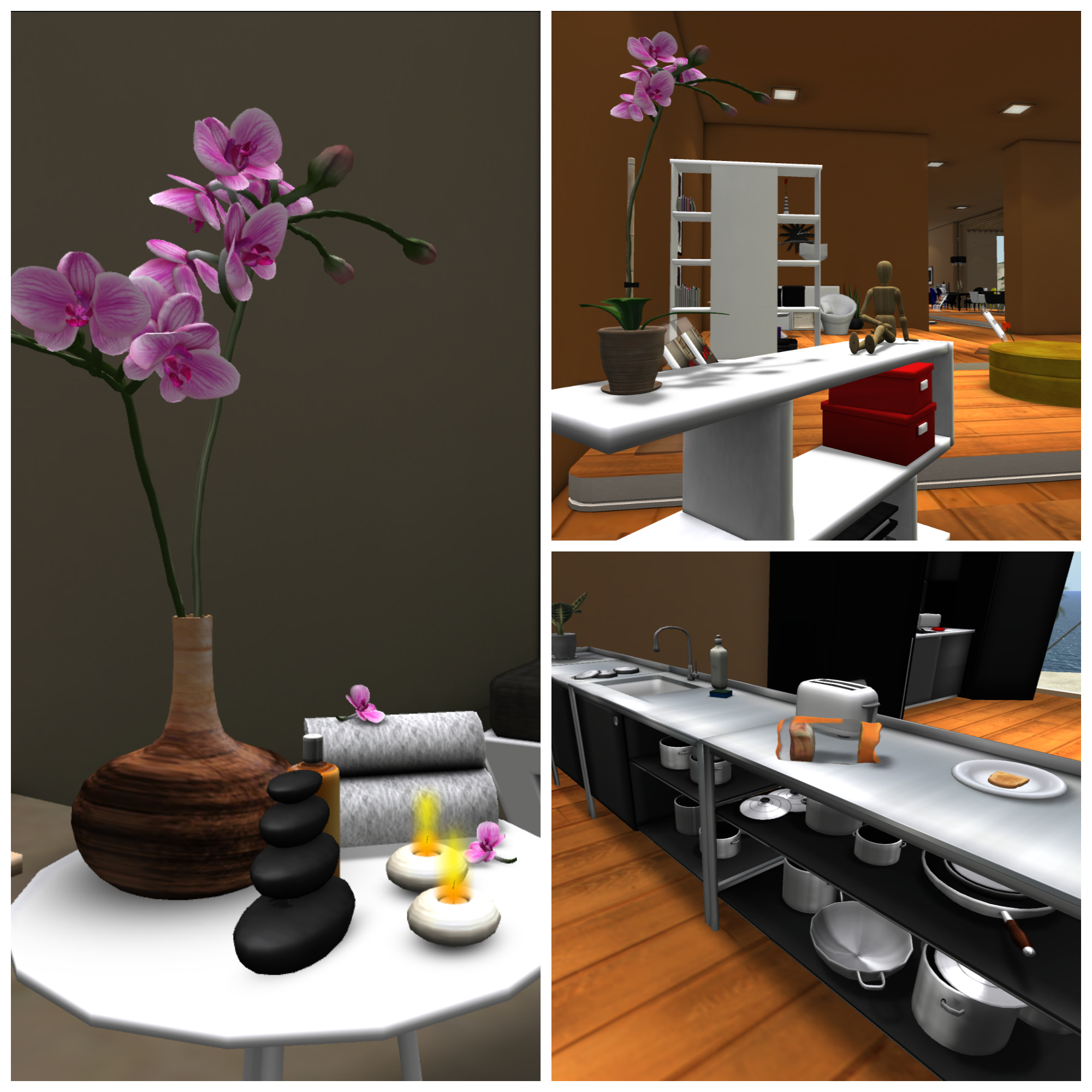 Take a wander around the store and you’ll find lots of really nice items.. If you have prims to spare the sculpt items are really worth splashing out on, not only because they’re reduced but because they’re actually really nice. There are lots of stone artwork pieces that would add the finishing touch to any living room, and an excellent spa table replete with hot stones (see what I mean about details?) really looks the part.  The bedroom sets feature scattered shoes, make up bags and nail polish bottles, all items that can be bought separately to add authenticity to your living space. (Sounds daft, but one of my favourite things is the half-empty loaf of bread and the butter dish beside it. They just work!)