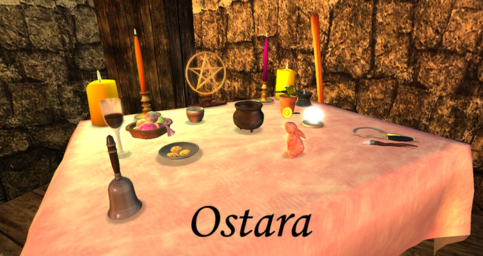 I’ve just learned that my favourite altars of all time, from Peculiar Designs, have been upgraded to make them even more awesome! Alas, they’re a little too prim heavy for my everyday use, but I’m hopeful that in the near future perhaps esteemed creator Poppy Teskat will come up with something to alleviate the prim count a smidgen, because to be perfectly honest I’ve yet to find altars that are this good. I’ve seen some that come very close, but there’s just something about the way her items are constructed that makes them worth the L$450 price tag. That may seem steep, but consider these an investment as you will never need another altar in-world again. In my pictures above I’m displaying the older versions which are still stylish after a few years, but I notice that Poppy now has new versions for sale that feature different rezzable props for each Sabbat. If you‘re planning your ritual for this weekend let me tell you that the Ostara version of this altar features a moon-gazing hare! How delightful is that?! (Picture below taken from Poppy’s marketplace listing)