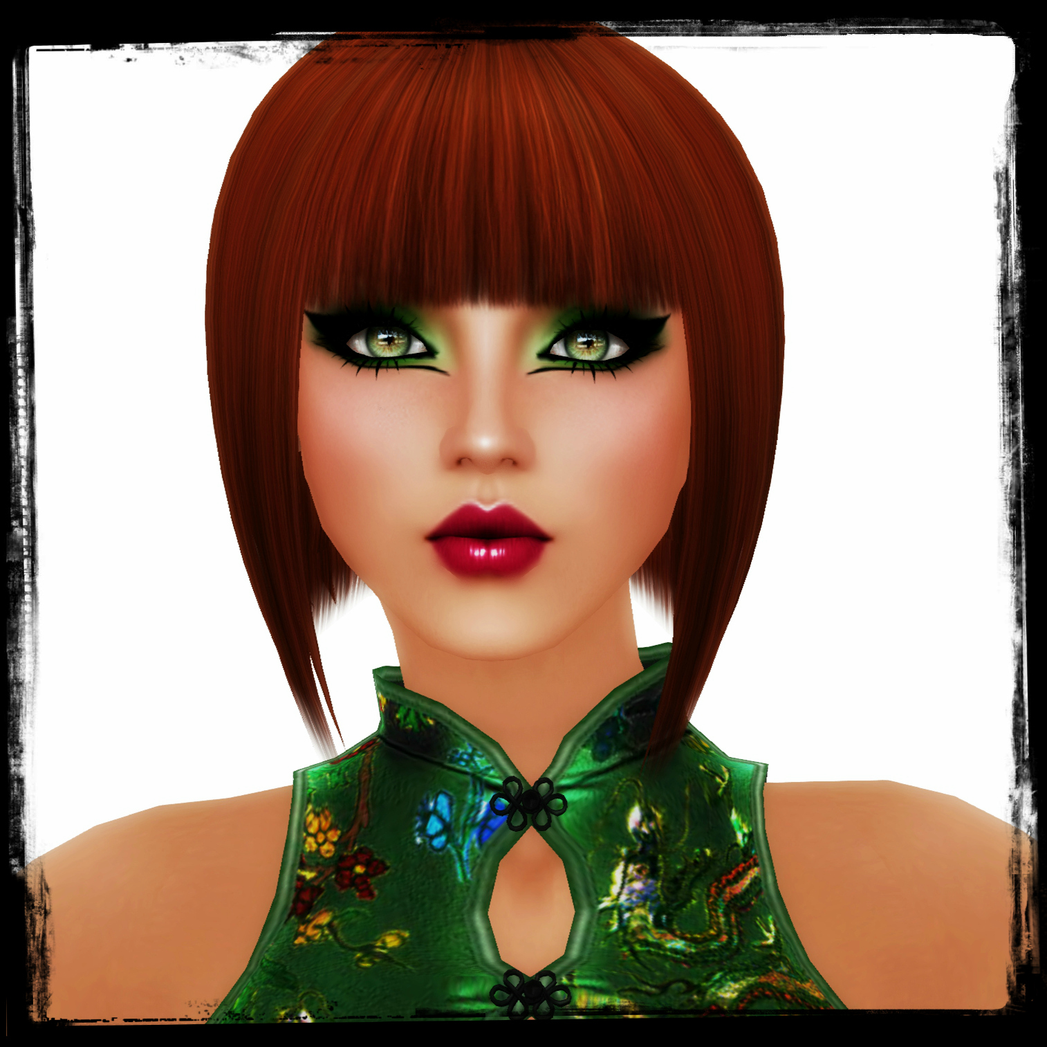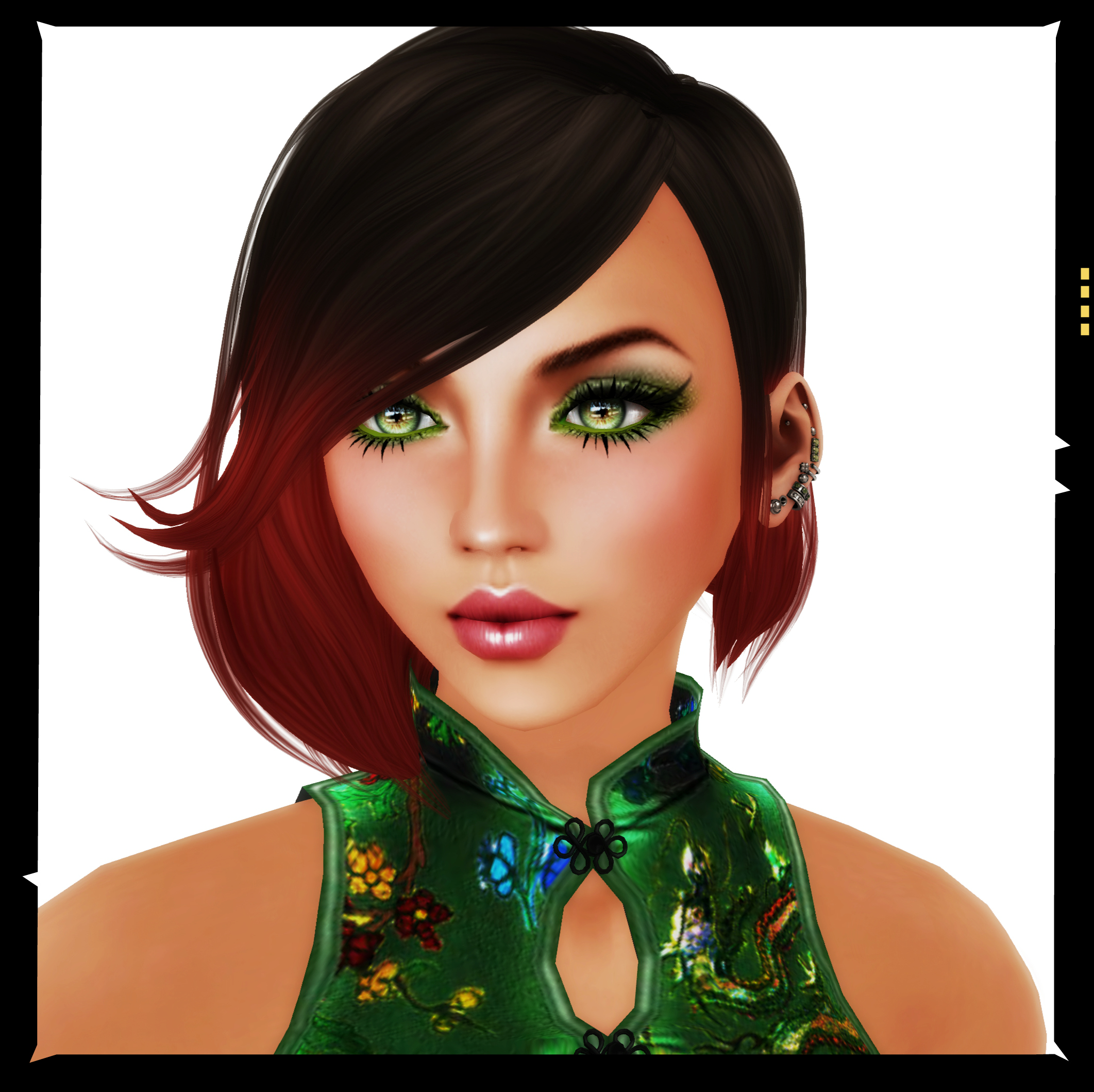 So what can you do with them I hear you cry? Well, for the picture above I wanted to wear a strong eye-make up to compliment the One Bad Pixel Cheongsam that I’m wearing. (Note: this is a complete fib because there isn’t a single bad pixel on this dress, it’s outstanding.)  At the moment I’m completely besotted with Izzie’s Asia skinline.   The skin I’m wearing in this shot is a medium tone from that range with dark brows.  Izzie  Button really is a talented wee minx, and is also incredibly obliging because she already includes excellent eyeliners, lipsticks and eyeshadows as part of her range, but I wanted something that would really stand out from the crowd. Thank goodness for the ability to layer then. I wore my regular skin, with Izzie’s own  green eye-shadow  and raspberry lipstick to which I then added my first purchase from the Cosmetic Fair, the Blacklace Beauty Exotica V.2 shadows and liners. These are an absolute bargain at L$99 for the package, which includes 11 sensational colourways. Once that layer was applied I was close to achieving the look I wanted, and finished by adding prim lashes and stunning Ikon eyes.