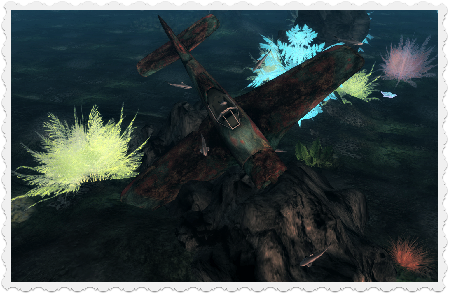 I mentioned that there was an underwater element to the occasion and it’s well-worth donning scuba gear for. I love the submerged Zero I found whilst exploring.  The underwater vista is really atmospheric.  This section is perfect for Mer-folk and virtual diving enthusiasts, and you’ll discover beautiful seascapes,  pods of cetaceans and the Oceanic Breedable sharks. (Strange as it may seem they’re not the only virtual breedable pet here, I thought it was only Turkish Van cats that liked the water but judging by the Kittycats that are on display it seems I was wrong! Some of them even like surfing…)