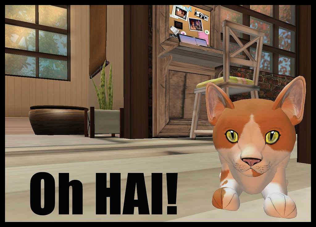 Oh hey… maybe Miss Kitty’d like to do a Pets piece for iRez? You could do the VR-Pets challenge and show of a pet or two… or… since we are trying to explore Virtual Identity, yet we’ve never talked about pets other than that small pix collection… it might be really cool if you wanted to do a little something on the Experience / Appeal / “Addiction” etc, that you described here.