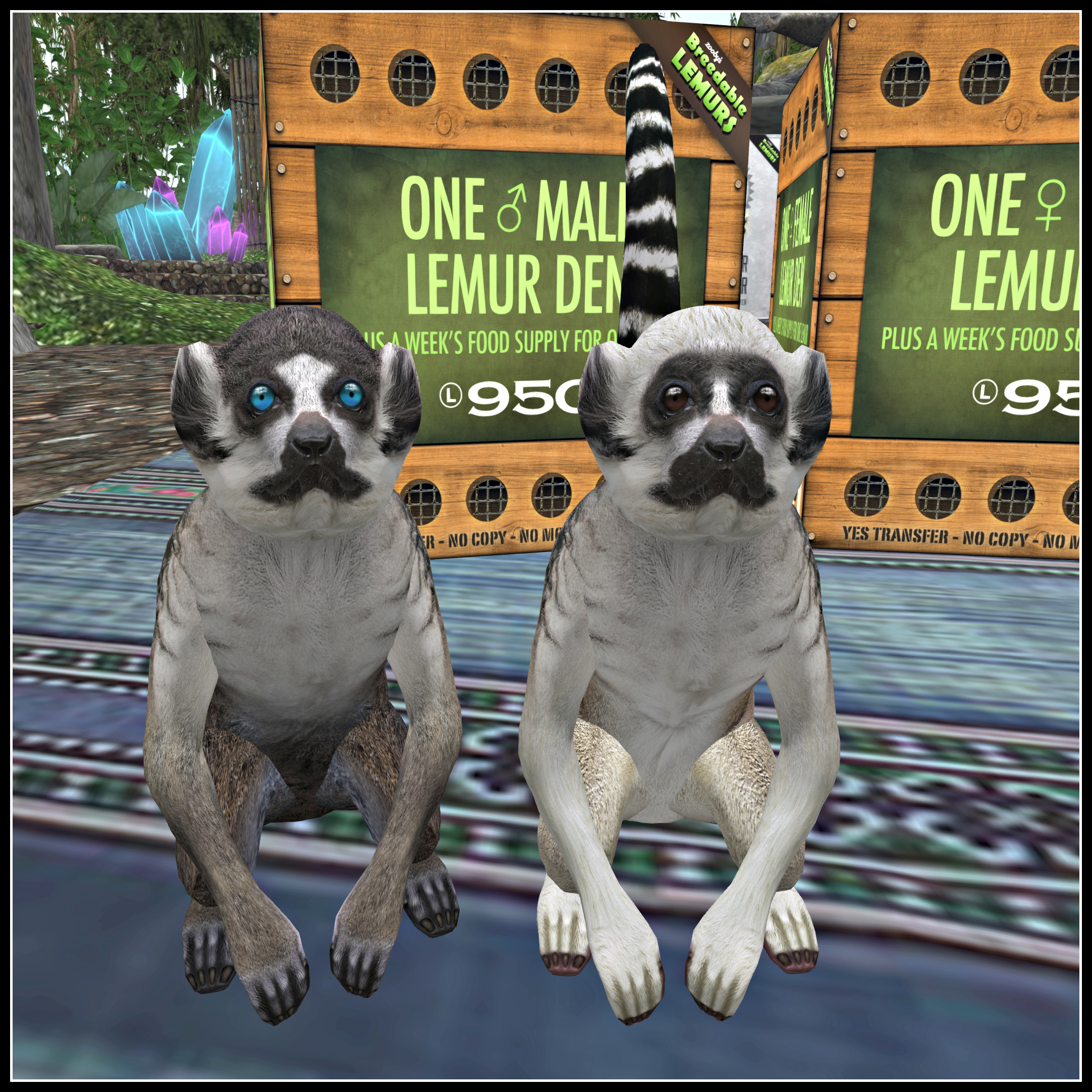 Now, I love lemurs. There is an amazing wildlife park within driving distance to me that has a walk-through lemur enclosure, and it is outstanding. (There’s also a very good one at Blackpool Zoo of all places, my father-in-law got licked by a very affectionate Red-Ruffed Lemur while we were there!) Being surrounded by lemurs chilling and basically enjoying themselves is a very enjoyable and humbling experience. They are truly amazing animals and to see them brought to the grid as a breedable pet is really quite exciting. Team that with the fact that these are made by Zoobys and you have a dazzling breedable prospect. I mean, let’s face it, Zooby’s creates the best animals on the grid; they are always beautifully built and rendered and the textures that are used to coat the creatures are just bang on.