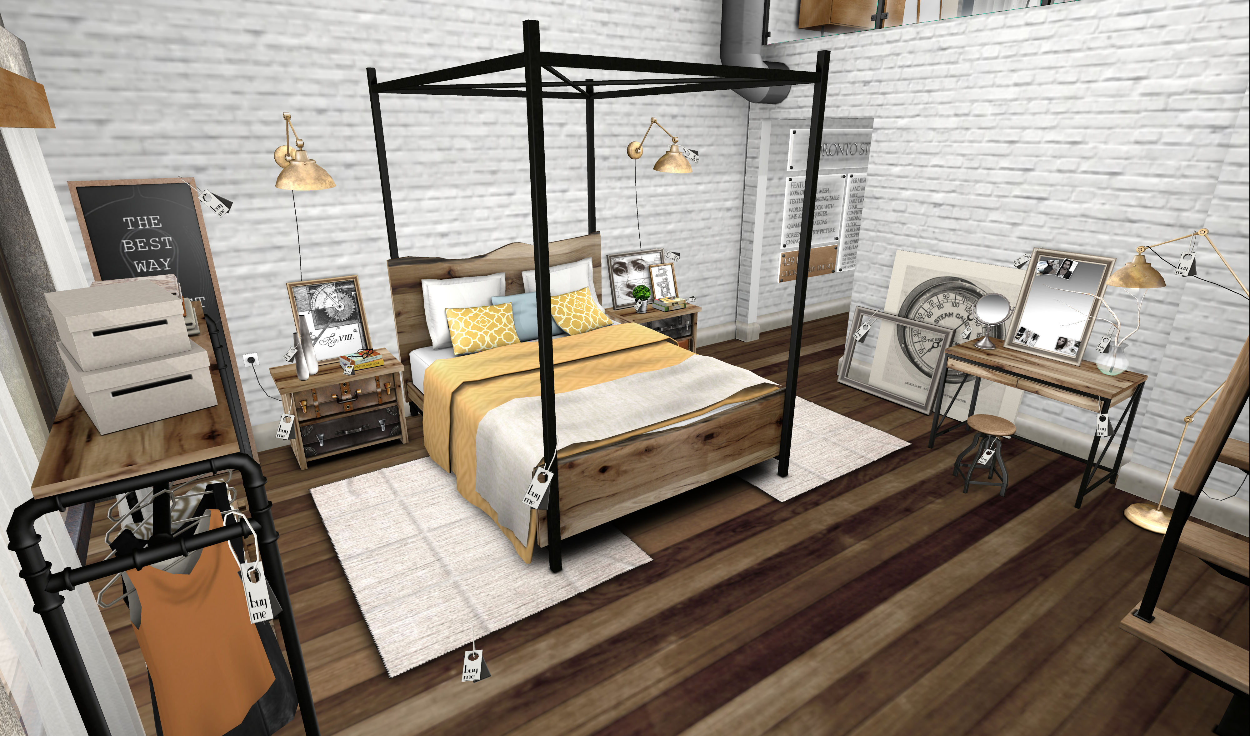 At the Home Show 2013 you’ll see the Toronto bedroom, Study and Arts and Crafts room displays are waiting for you to wander around and experience them to the full. All of the items are beautifully presented, and on the walls you’ll see a listing of the land impact for each item. Rest assured that every single piece is bloody wonderful and unique in its own way. For example, the Arts and Crafts room features a drawing table, pots of paint, a designer’s mannequin and canvases primed and ready for you to create upon. If you need some ideas you’ll find prints from Leonardo Da Vinci and other resource materials on the shelving unit ready to inspire you.