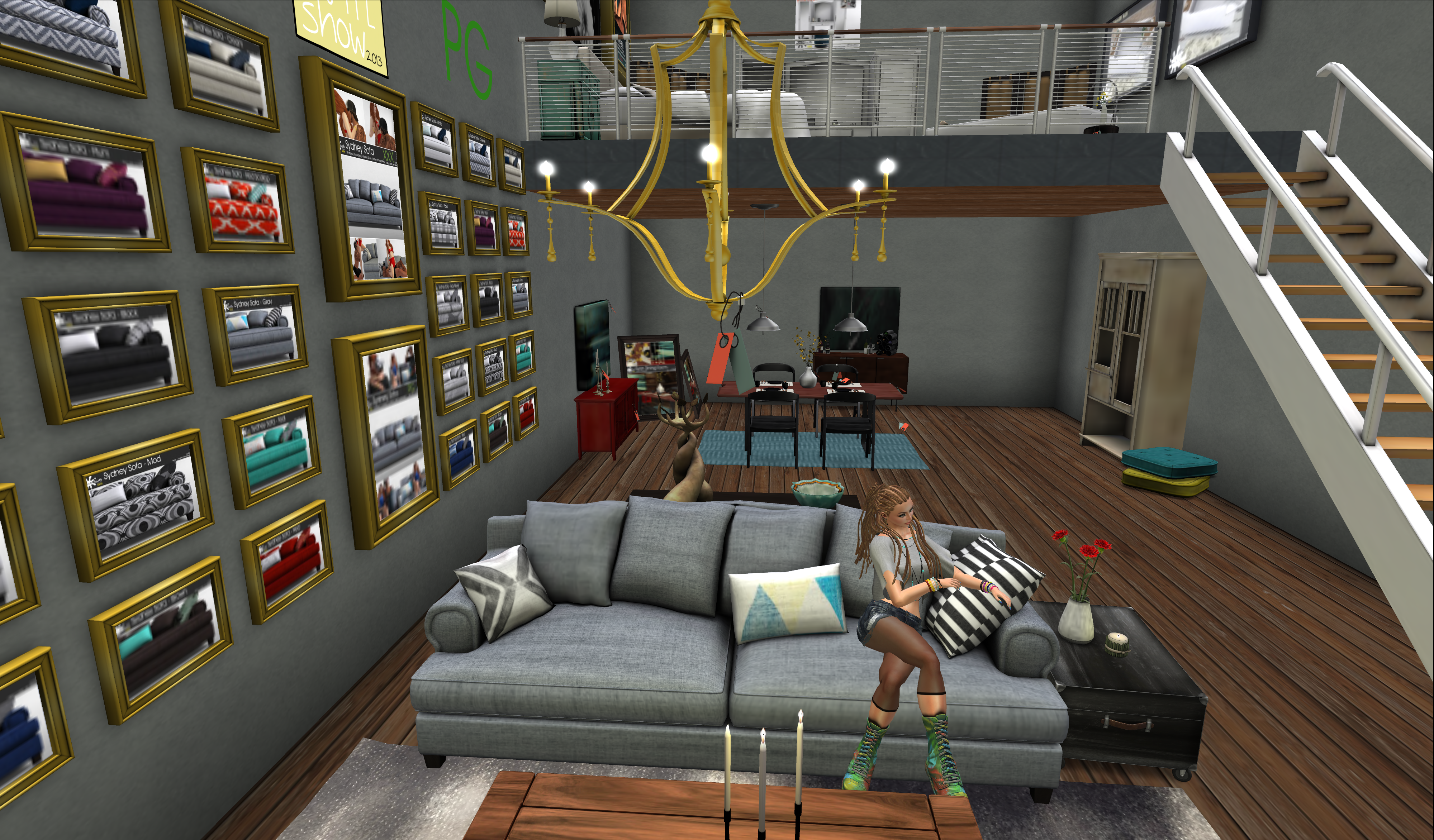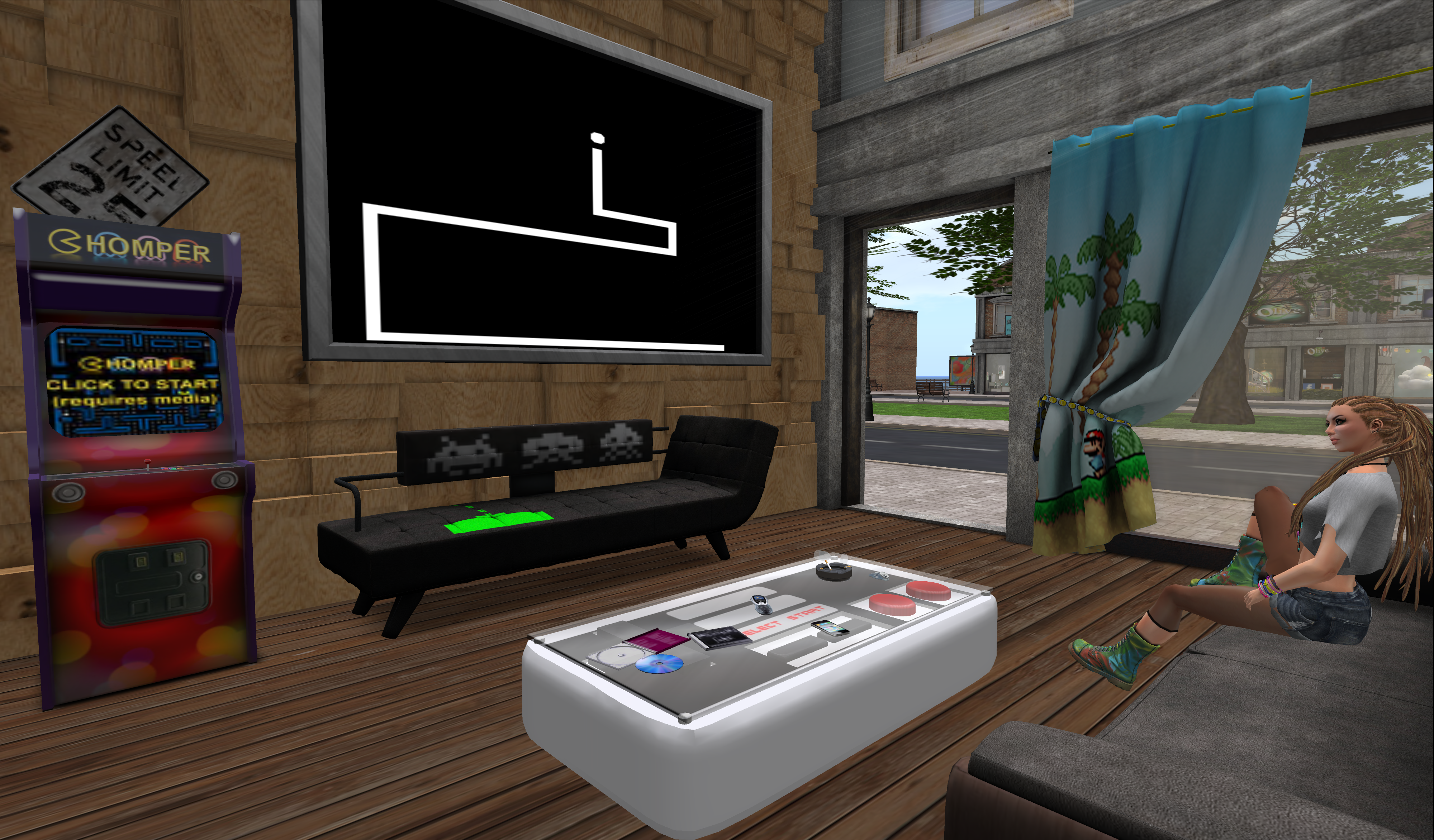 MICHIGAN’S SHACK has every gamer’s fantasy catered to with a fabulous retro gaming sofa, arcade cab, table and wall art. (This is the kind of furniture I’m sure my beloved would love in real life. In fact, he has 24 arcade machines already so I sort of wish he had those in Second Life and this furniture in his real one instead!)