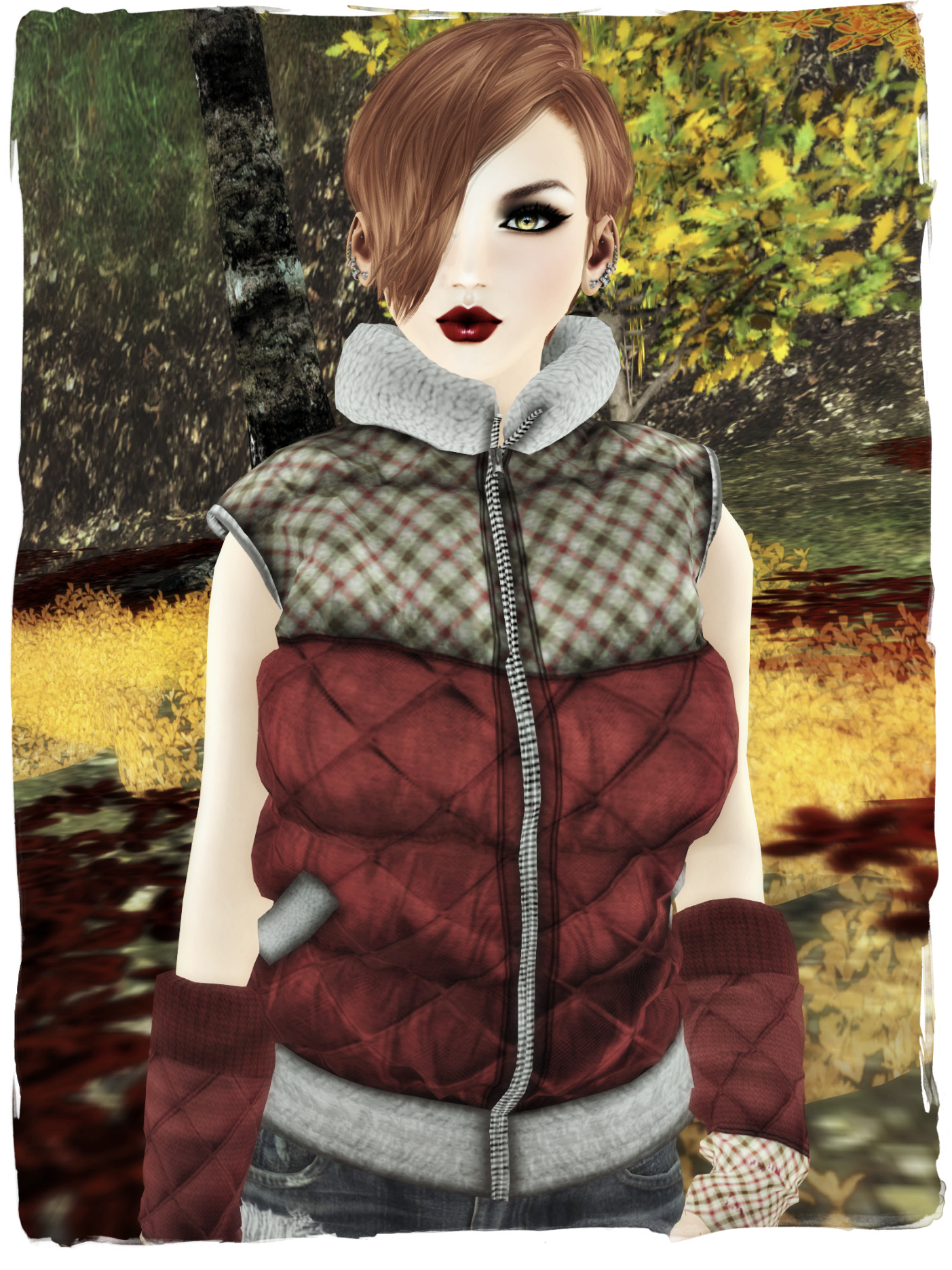 I found exactly what I was looking for in this rather excellent mesh body-warmer from NS CUTIE SHAPE. It’s called ‘Emotion 1 Padded Vest’ and is available in a variety of patterns and is a scarily reasonable L$50!  Not only that, it includes matching wristwarmers too.  I opted for a glorious dark red and green tartan combo with a luxurious chunky grey fleece collar. It’s very well textured actually, considering the price. I teamed it with my shorts and tights combo (which you can’t see in the picture but trust me, it’s there, I’m not bottomless I promise!) and set off to trudge around some Autumnal sims.