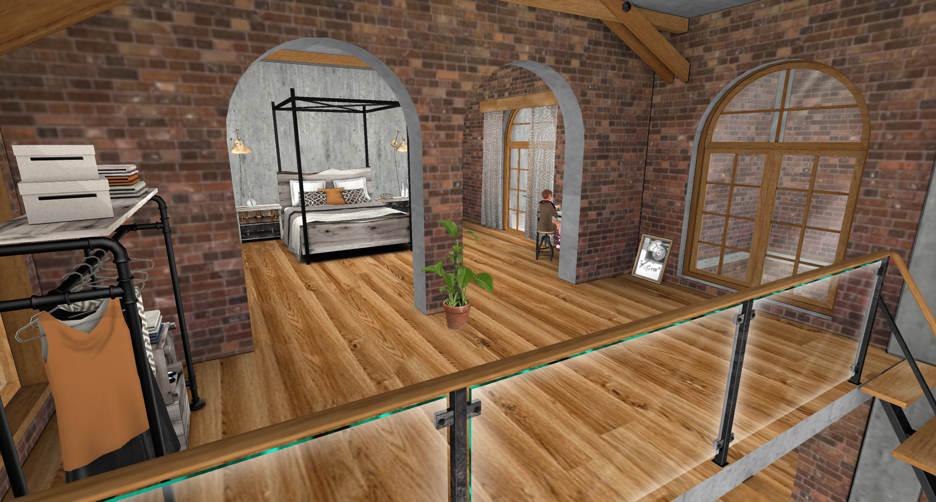 First things first, I REALLY love that this home takes on the industrial flourishes that are hinted at by the Toronto furniture range. The emphasis is on clean lines, brick, concrete and metal. It’s back to basics but done so beautifully that it exudes a warmth that you would normally expect from a much grander build. The exterior is a delicious combination of wooden windows, bare brick and grey, weather worn concrete.. There’s a spacious patio area and a smaller deck to the rear.  To the side is a metal exterior staircase leading to an open roof space perfect for after hours partying with friends. A nice touch is the tree that rises up the brickwork to the rear of the build with a flourish. An even nicer touch are the extra trees (including bare and leafy) and the grass texture  that the house package includes, enabling sympathetic landscaping around the house.  A thoughtful bonus.