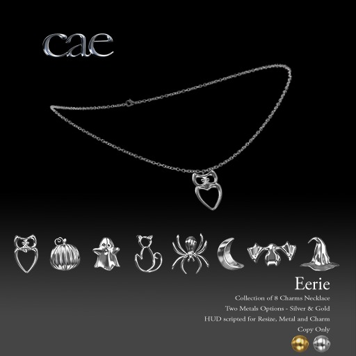 Discovering this ‘Eerie’ set was a real treat for me, because even though it’s obviously aimed at the Halloween market, it can be worn all year round should you so wish. In fact, it’s nice to have a change from wearing a pentacle. As much as I adore them (and have zillions in both real and Second Life) it’s good to have something a little different to wear and subtly declare your Witchy affiliations.