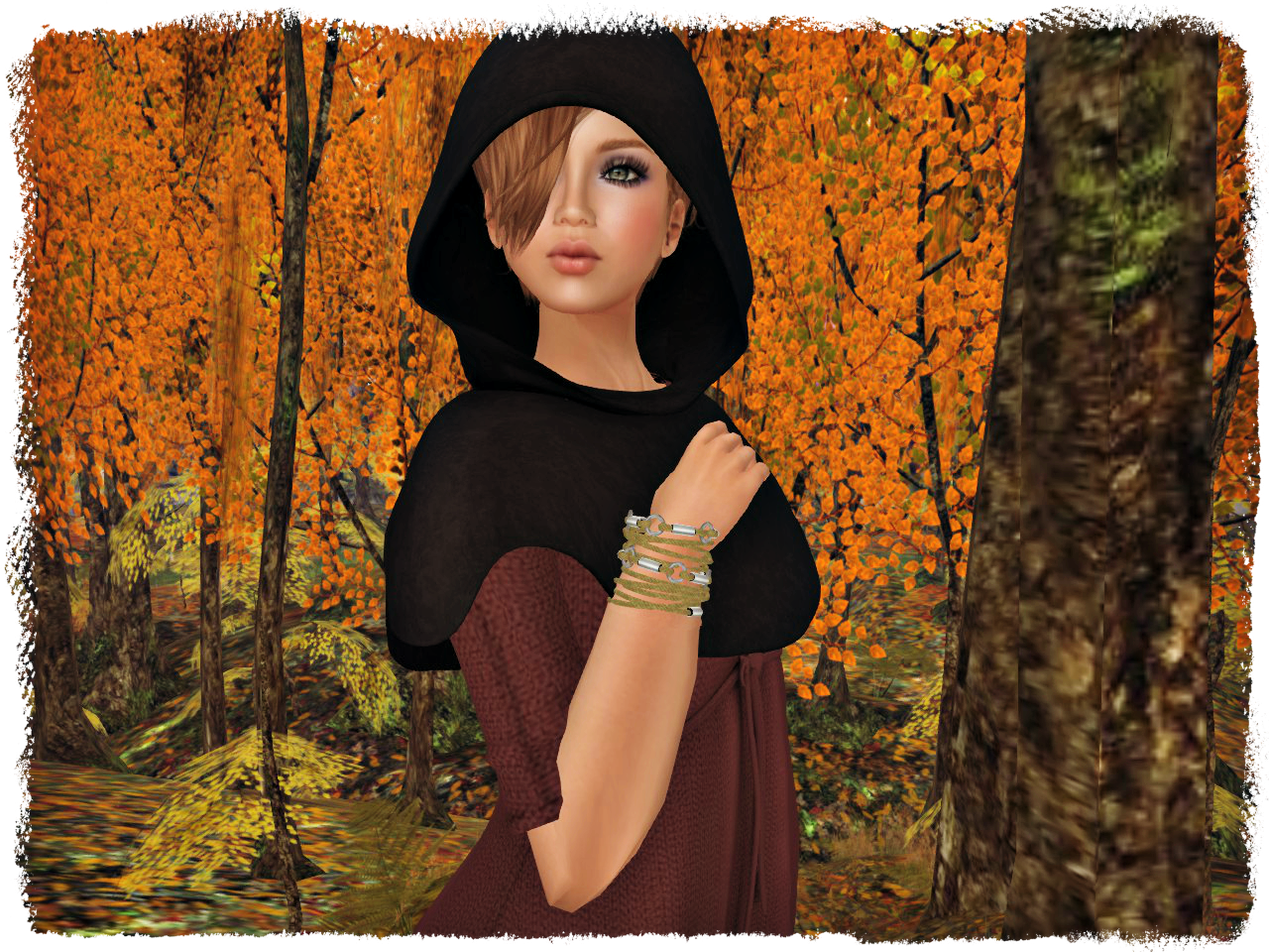 Of course, now that the Samhain season has passed, you may be feeling that the time for buying the spooky wares on display has ended, but that couldn’t be farther from the truth.  Many of the items have lasting appeal and can be adapted to suit different looks and outfits. Here is a couple of examples to get you going. In the picture above I’m sporting the FRI.DAY ‘Raven’ hood while I enjoy an Autumnal jaunt in the woods. I’ve slipped it over the COQUET ‘Miranda’ frock that I picked up at this round of FAMESHED, but you can add it to a variety of outfits and it remains really effective. Of course, you can wear it as part of a role-play set-up too; add a quiver of arrows, and you’re well on your way to evoking the spirit of a famous woodland outlaw.