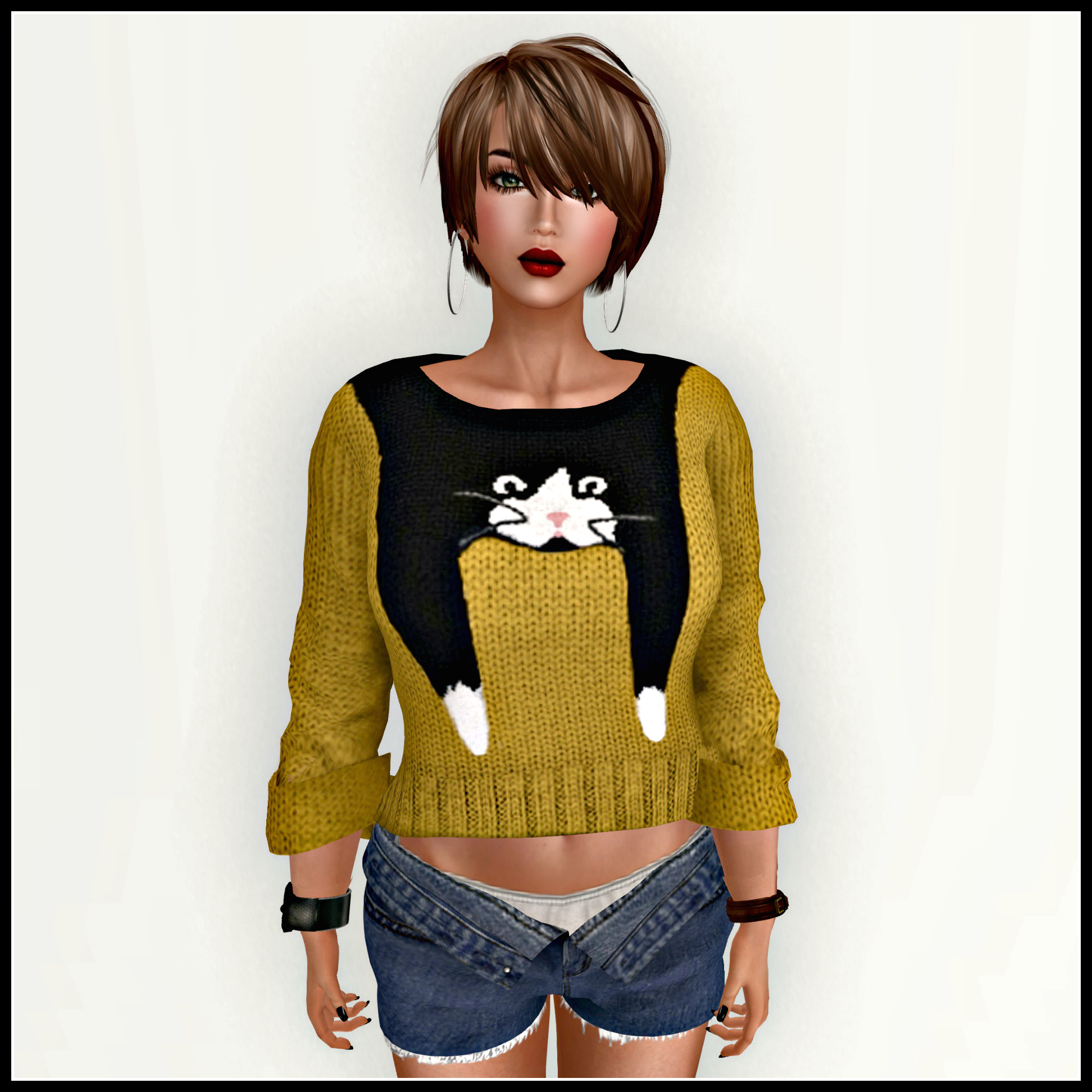 Another cat sweater, this time a knit that is fun and funky and yup, I’d wear this in real life too! This is from FRANKIE (formerly known as IMBUE) and I really like it. The texture looks good up close, and the cat pattern is pretty funny. (It carries over onto the back of the sweater too.) I added shorts and hooped-earrings for a casual, street wise look. The sweater is available in four shades at L$95 a pop. There are a few other cat-themed items in the store as well, and I really enjoyed my visit there. The store is well-styled and there’s a great ambiance to it. My only issue is that a few things I’ve purchased from the store haven’t fit as well as I would have liked, but I had no problems with this sweater at all. Oh, and be warned; I couldn’t stop singing ‘Frankie’ by Sister Sledge once I’d visited, and trust me, that didn’t do my cold symptoms any good at all.