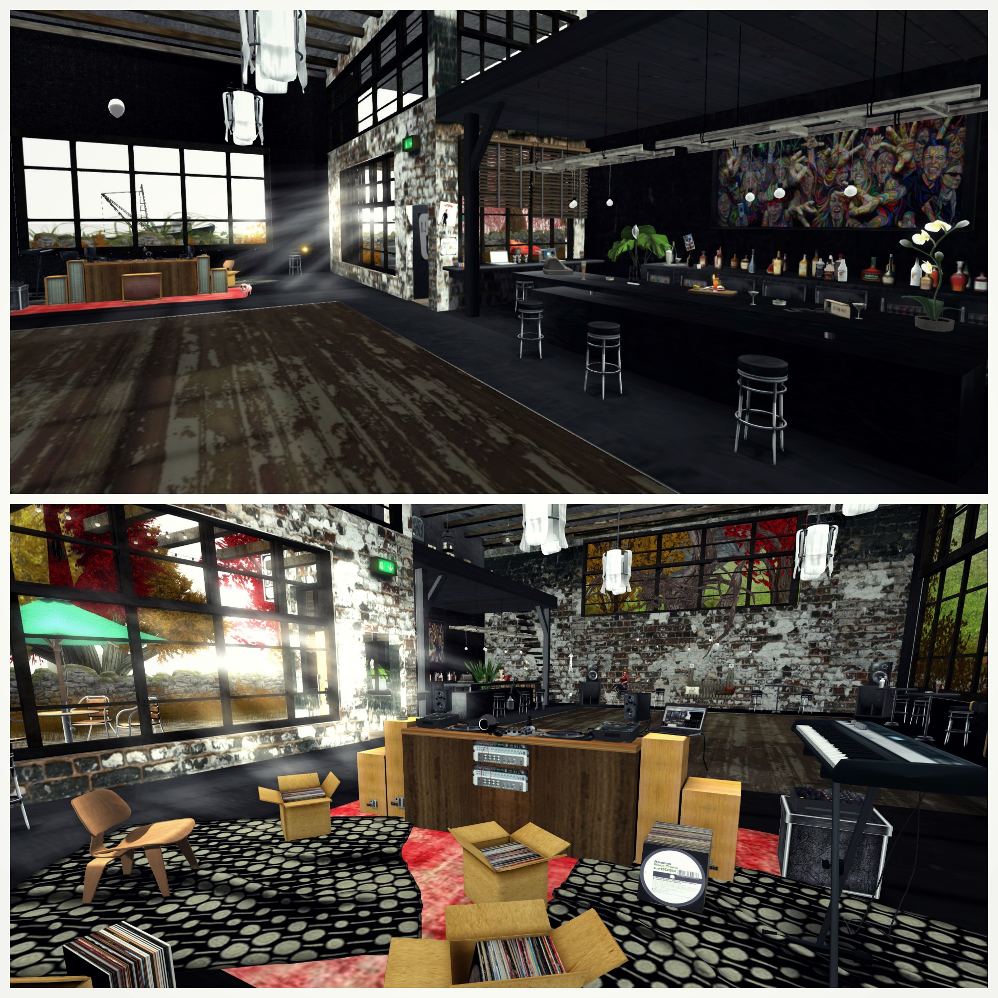 It’s quite small, perhaps it’s better to say ‘bijou’, and even though it was empty when I visited I was struck by the character of the space. It really looks the part, ample amounts of mesh objects and textures deployed to give a lived-in yet funky feel. There’s a small sun terrace next to the entrance, which leads straight into the dance-floor area. I really liked the DJ area, instead of a hi-tech glass and chrome cabin as favoured by many locations, this is an open space filled with wooden units adorned in decks and festooned with records. There’s an old-skool arcade machine, along with an area to sit and surf the interwebs. An open staircase leads up towards a single deck area decorated with a large comfy sofa and contemporary prints. Towards the rear there’s an outdoor chill-out area, and the whole building gazes out onto a distant fishing boat as it sails the Second Life sea. The whole place is perfect but there’s just one problem..there’s nobody here!!!