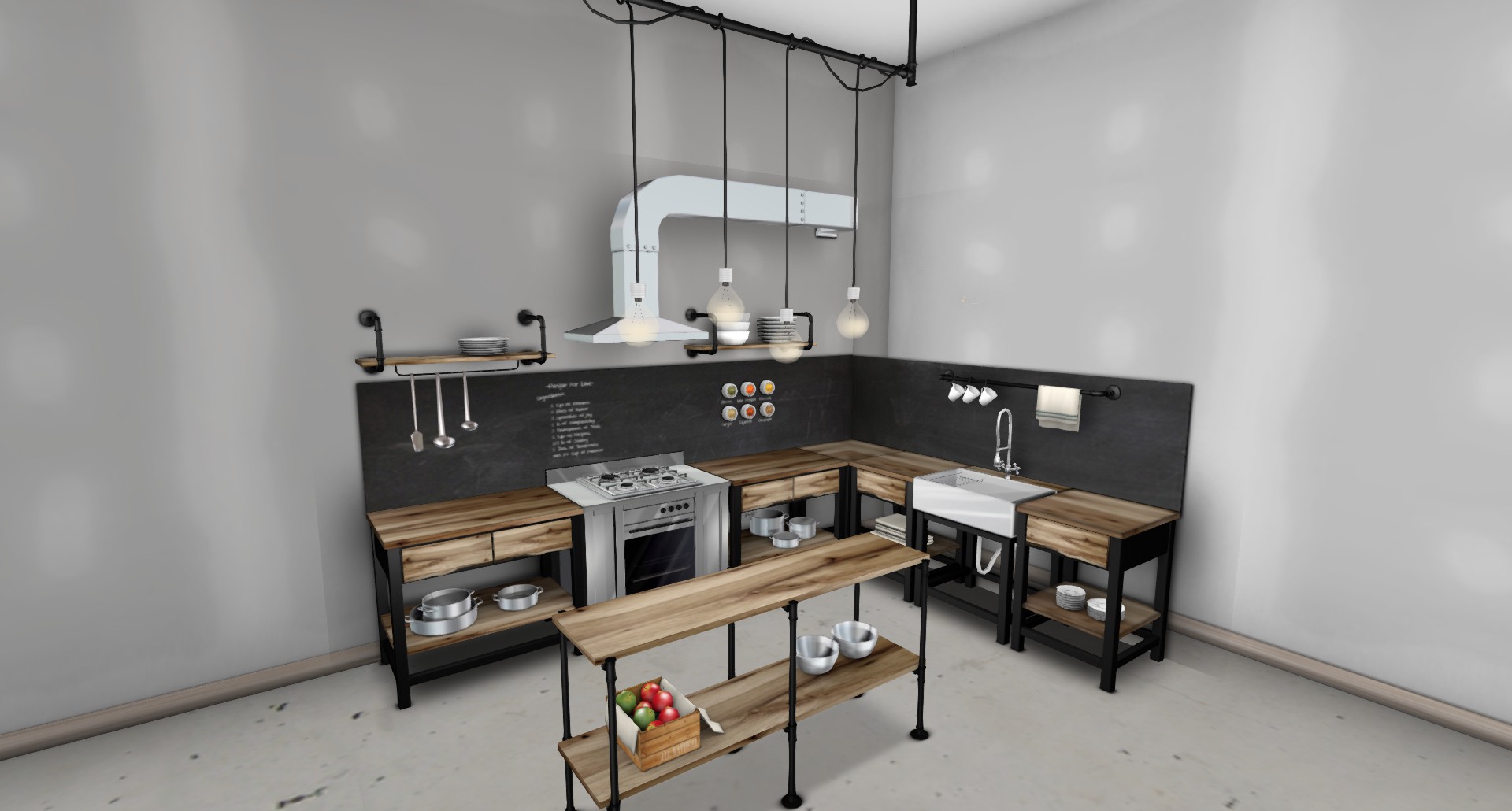 Once I had finished wiping the drool from my monitor and keyboard I got to playing about with the items included. The Toronto Kitchen is a modern, modular set-up that you build using the components included in the package, so you have tons of freedom to design your dream kitchen to fit perfectly in your given space. Like everything in the Bazar Toronto range, the kitchen is predominately wood that can be colour-changed to light, medium and dark at the click of a button. The open-plan styling means that you can add pots and pans and accessories to your hearts content, but the units do come complete with some lovely accessories already included, such as stainless steel kitchenware, utensils and plates.