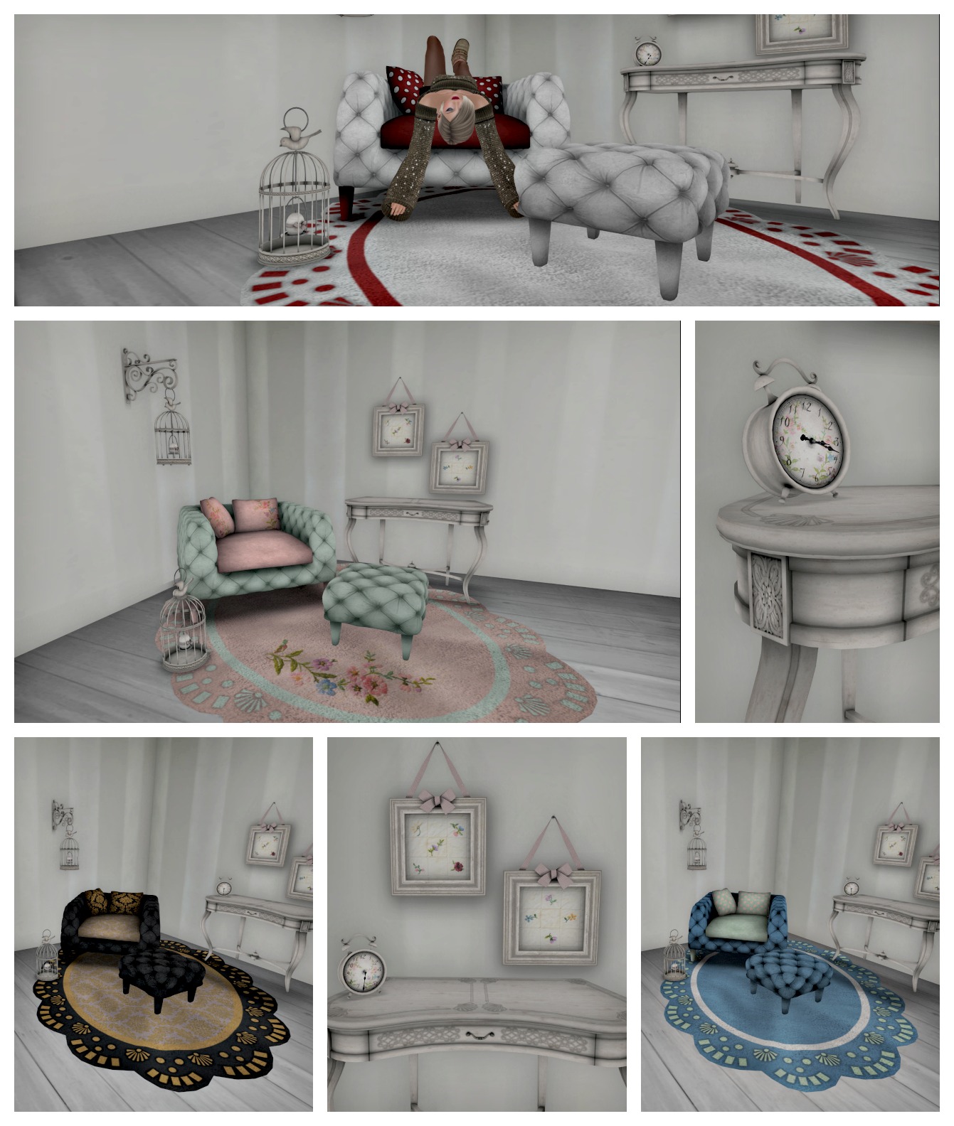 The carpet, pouffe, chair and chair cushions can be retextured via HUD so that you can mix and match for your perfect look. There are a number of vibrant colours and patterns to pick from; the red and white selection is especially festive for this time of year. Of course there are poses installed in the furniture too; singles and couples poses that work really well and the cuddles are very nice indeed. It’s a very cosy, stylish and ultimately pretty set that will look great in your home, and can be purchased, as I mentioned before, at the 2013 Christmas Expo 2013 in support of Relay for Life of Second Life and the American Cancer Society.