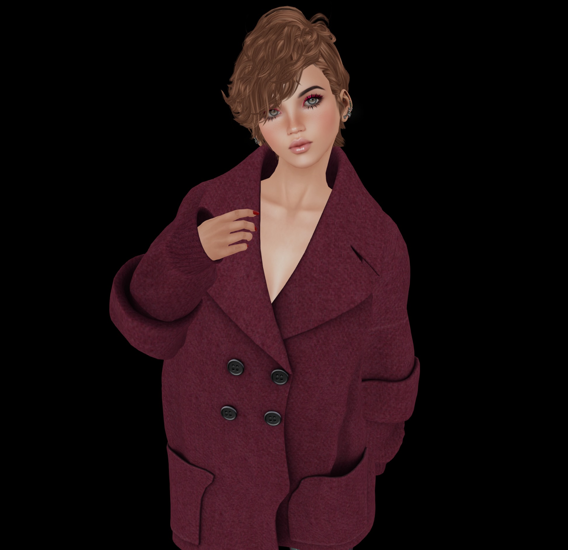 The over-sized shape allows a lot of space for a glorious texture, and it’s finished really well, which is just what you’d expect from Onyx Leshelle.  Onyx is a creator par excellence and whenever she release anything new to the grid you can practically hear the rumble of a squillion avatars feet running towards it.  I love everything about this coat. I could even lick the ruddy buttons I love it that much. Best of all? It’s just L$188, which is a bloody scandal really. It’s available in six variations and every single one of them is as delicious as the other, but for me it just had to be this gorgeous red, called ‘Syrah’.  I’m sure Jez could fit in this with me, which would be super cosy indeed!