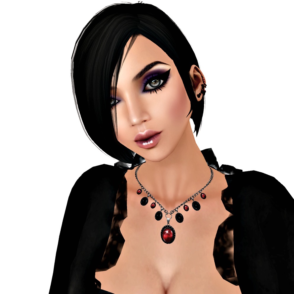 First up is this absolutely outstanding skin from Jalwa. It’s called ‘Coven’ (I’m bound to like it with a name like that aren’t I?) and it is absolutely divine. In fact, it is absolutely everything I need in a skin; gorgeous base tone, attentive detailing and scrummy, yummy make-up. What I really love about this skin are the details: the eyeliner and brow-shape are striking and the lips are just astonishing; very moist, with a beautiful shape and detail. In fact this skin has made me hungry for more from Jalwa; I’ve visited the store and picked up a few demos to try. Oh, I must just point out something else I spotted on this skin that I really like; there’s a mole on the right bewb and it just looks really quirky and pretty (and REALLY draws attention to your norks in a good way!) Trust me on this, it’s well worth investing in! I don’t know much about Chandra Masala as a designer, but I do know that I am now incredibly keen to know a LOT more!I’m also wearing a beautiful dress and necklace from M.V. You can *just* see some of the frills that adorn the ‘Translate’ dress in-shot. This is a fabulous number, with more than a hint of dandy about it, featuring full length, fluted sleeves, a stylish corset and a skirt with a high front, making it an incredibly effective and dramatic dress indeed. It’s an inspired creation from Lokii Violet. I’ve teamed it with another M.V release, ‘Aggy’s Necklace’ in tarnished silver, which is a Gacha prize and is nothing short of exquisite. It’s so pretty and very Gothique! The red jewel makes it very festive, but of course you can wear it all year around. It’s a great piece, and there are a number of colours available including a very lovely rare.