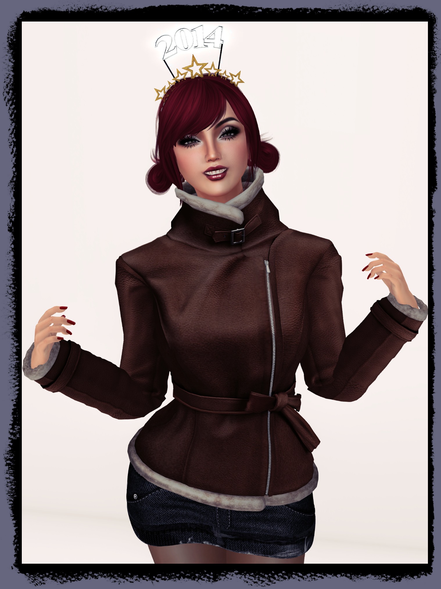 It’s not just the shape that appealed to me about this jacket either, the leather texture is one of the best I’ve seen yet in Second Life, and it’s been applied beautifully. The lighting and shading and creasing all look spot on too; zooming in for a close-up look is very satisfying indeed. The jacket is chunky and ‘feels’ substantial, and detail such as belt-loops and even the tortoiseshell buttons on the cuff-straps look excellent. Nothing has been neglected. To top it all off it fits like a dream; I opted for the medium jacket and have had no issues with it suiting my shape. I opted to team this with a skirt available at the event from the same designer. I’m a sucker for a short, denim skirt and MARSHMALLOWS has three at the event in blue and dark-blue denim, as well as black. I opted for the darker shade and again, this is a great piece of mesh. There are no added studs or stitching elements here, instead texture is used to suggest those elements and on the whole it works really well. The bum-pockets stick out to add a 3D feel, and the skirt looks authentic. It will wear really well with tees and other mesh items in my inventory, I’ve no doubt about that. The skirt when worn with the medium jacket presented me with no fitting issues, which is a blessing when wearing multiple mesh pieces, and I couldn’t be happier with my outfit. Congratulations to RoMy Dash on her sensational work, and I’m looking forward to more of the same in 2014!