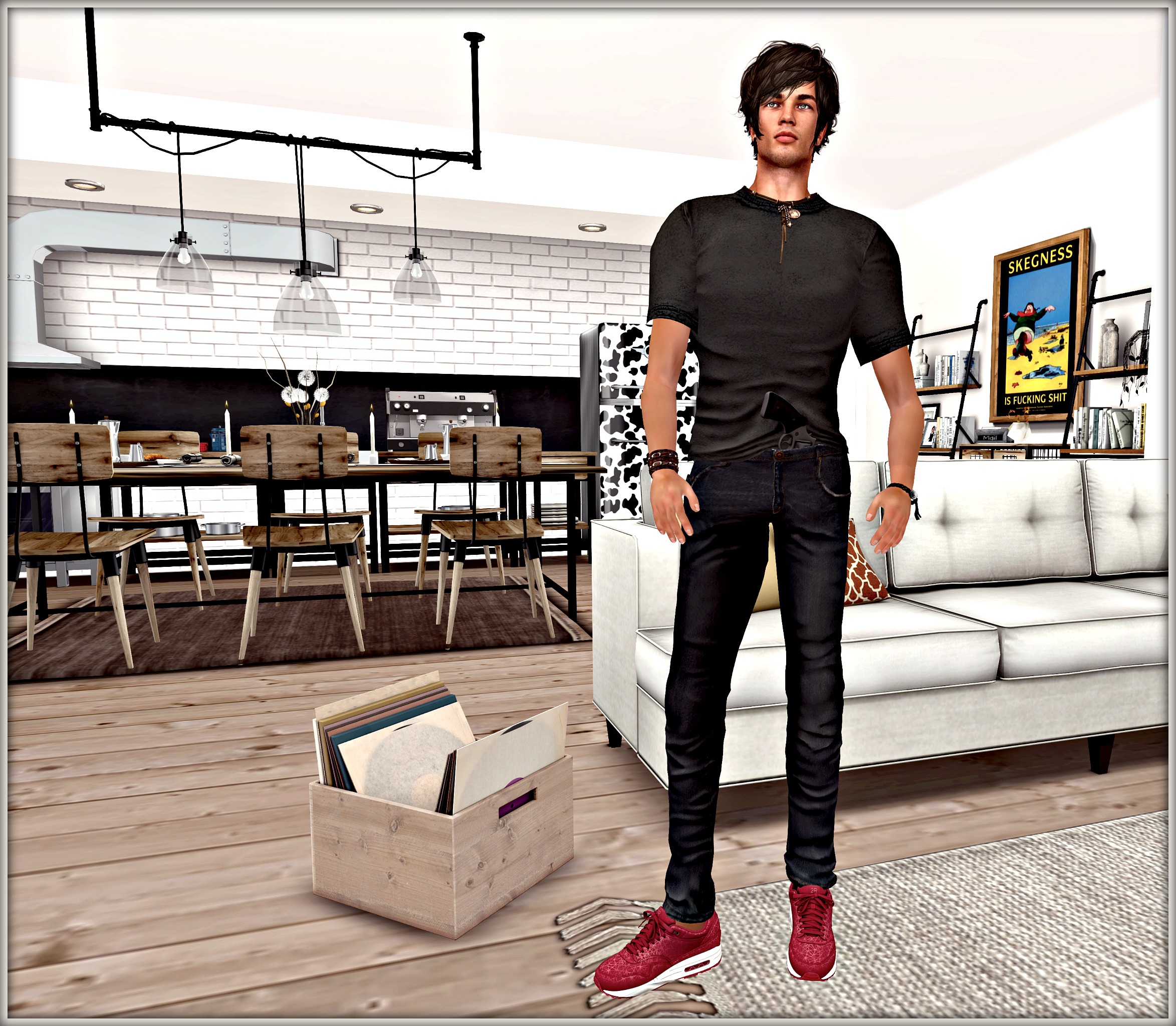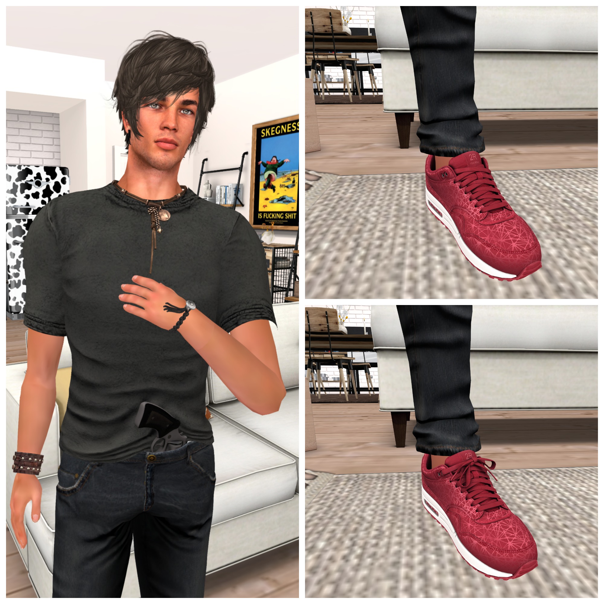 To finish Jez’s look I treated him to some snazzy footwear courtesy of  2REAL. These ‘Max Crystal’ trainers really are the dog’s cogs; when you wear them and zoom in the level of detail is gasp worthy. I know for a fact laddo would wear these in real life so it was very satisfying to see him wear them in Second. There’s a nifty HUD which enables you to wear your shoes with laces or without; he doesn’t have a preference apparently, but like me he really digs the pattern that embellishes these and the window in the sole giving them a retro look suggestive of Nike Air Trainers.  I do love it when you zoom in on something and it looks absolutely amazing, don’t you? Pro-tip: Buy these in a really bright colour as a contrast to your outfit to get heads turning!