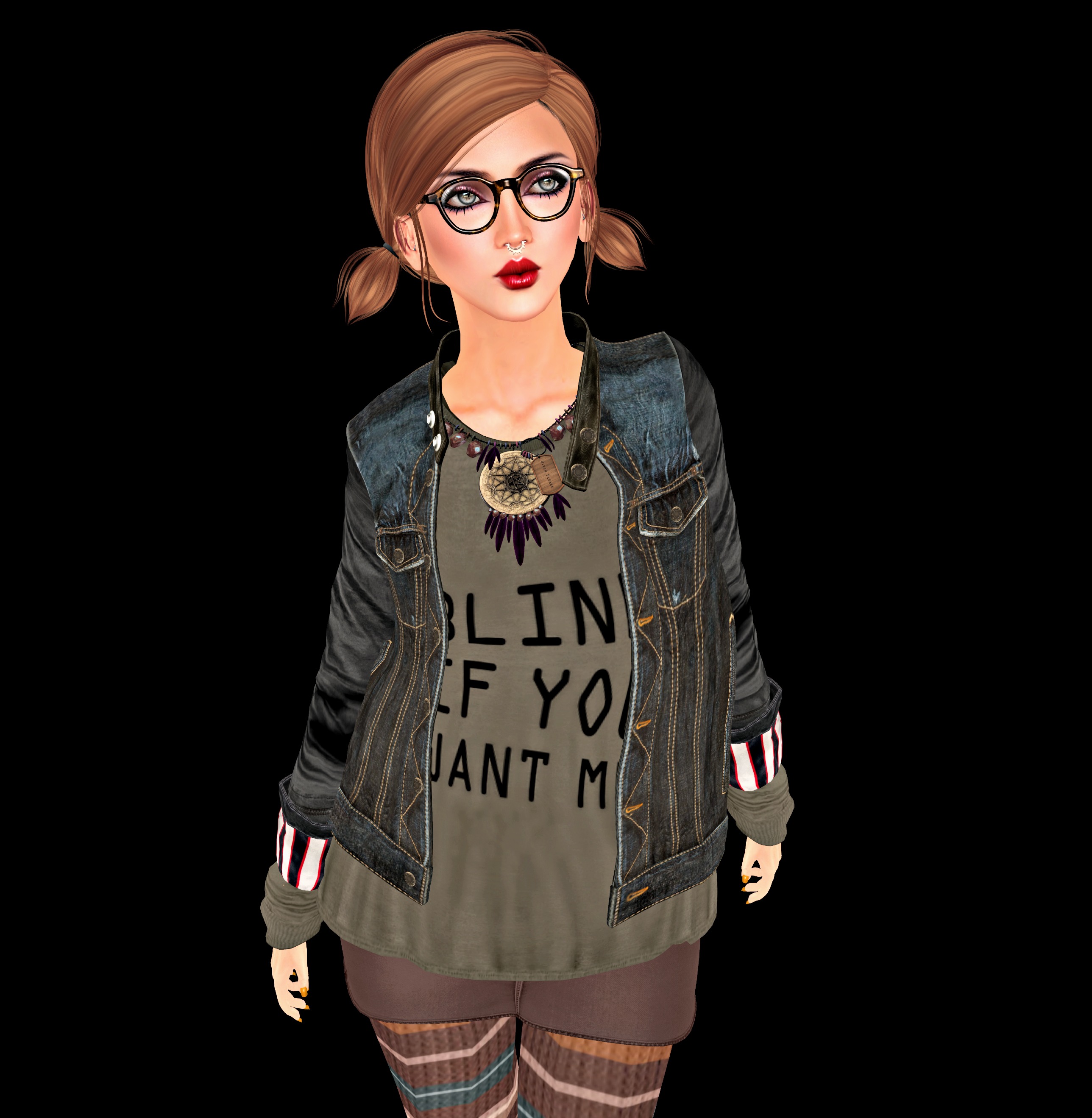 Let’s start with the fabulous denim jacket and tee combo that Kitty is sporting. It’s by COCO and is available from THE MENS DEPT. I love this vintage denim jacket styling and the upturned sleeve detail looks great contrasted with the baggy shape of the jumper underneath. This is a beautifully crafted item and a real joy to wear; the shape is completely realistic. I’ve teamed it with some old inventory finds; there’s a brown denim skirt from TEE*FY and some woolly tights from FISHY STRAWBERRY. I’m still enjoying the BELLEZA ‘Chloe’ skin, and I’ve worn it coupled with lipstick in a nice red (that was a tattoo layer included with the skins).