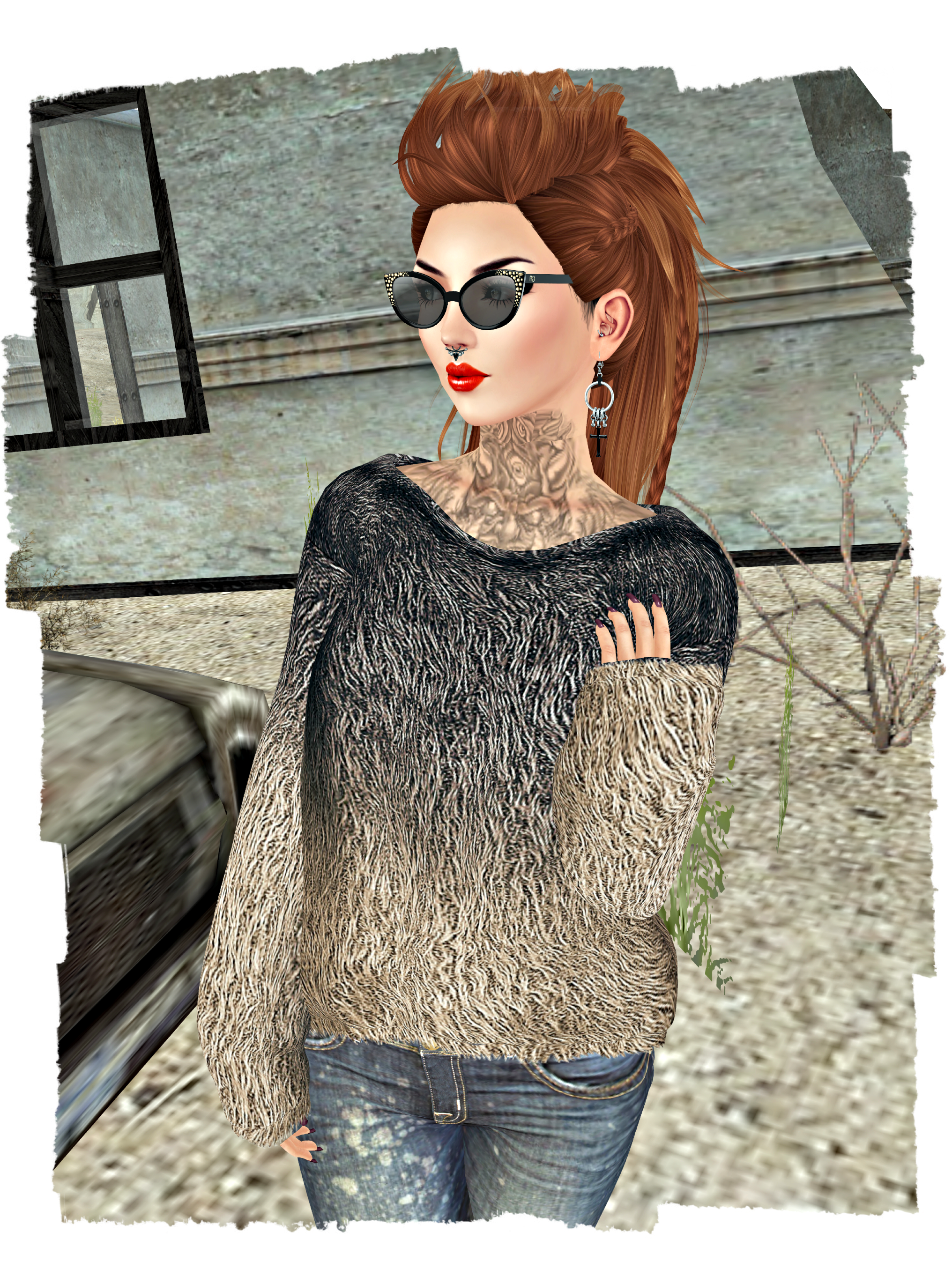 Second Life’s latest regular quality event has hit the grid running in a Mad Max style from the impending apocalypse. There are skins, fashion, hair and accessories to die for, as well as a fantastic props and even a fallout shelter too.  It’s a hardcore collection with some fantastic pieces. I’m really taken with this fantastic ‘Doom’ pullover from EMERY; the sloppy style and the gnarly, straggly fibre finish really work. I added earrings and bracelet (not seen) from MAXI GOSSAMER  and finished with this epic release from TRUTH, ‘Rogue’.  It seems Truth’s on fire at the moment with some absolutely storming releases over the past few days.  This one comes with an optional gas mask but if I’d worn it you wouldn’t have been able to see my gorgeous chops..*ahem*