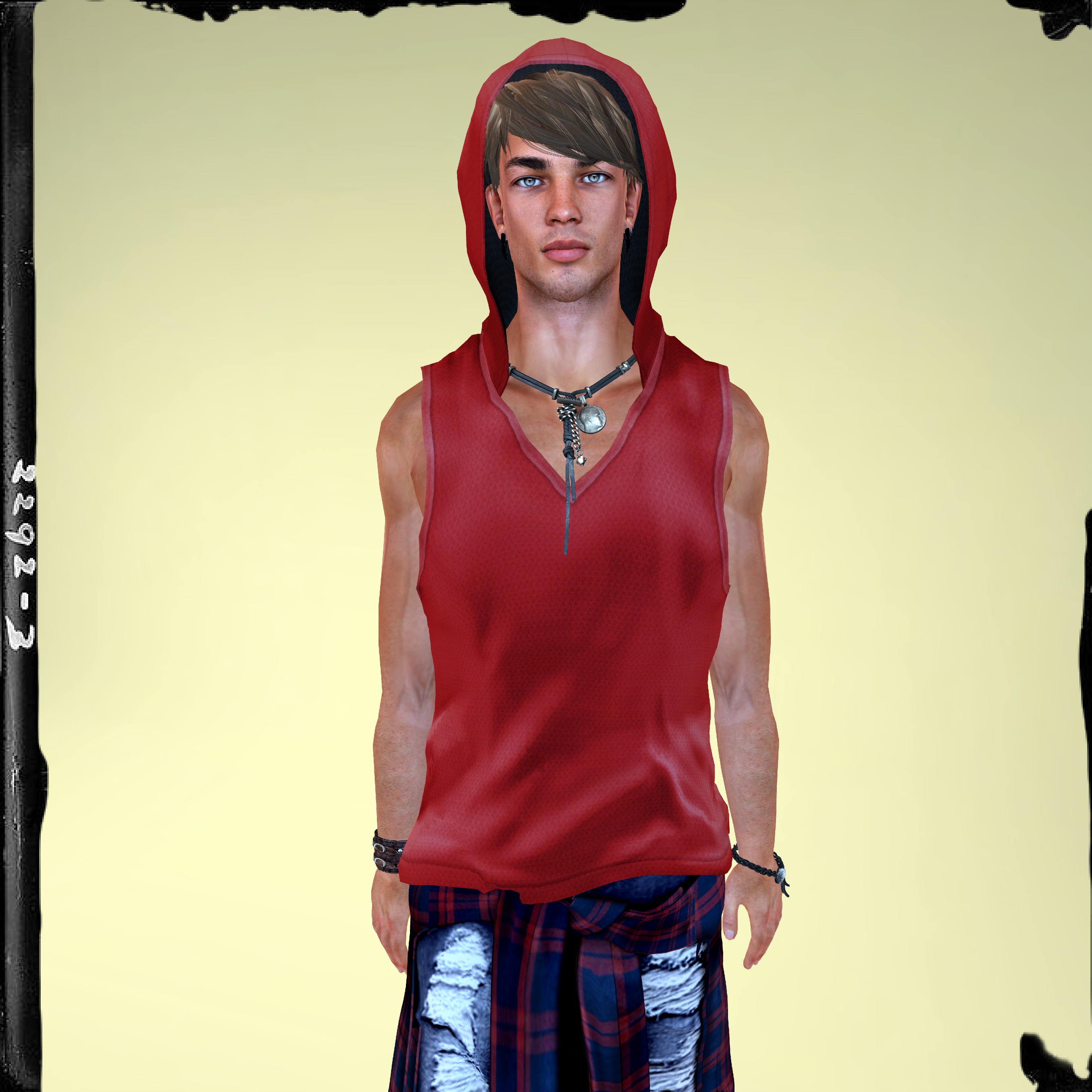 Anyway, back to this delicious denim. The jeans are  available in a number of shades from light to dark,  but Jez opted for the latter, and as if the shape and texture of the denim wasn’t enough, there’s the addition of a built-in shirt tied around the waist too. This adds a really funky urban element to the look, and can be texture- changed into a number of different shirt styles due to a HUD. To  contrast we added this bloody outstanding sleeveless hoody from BLANKLINE.  Not only does it have great styling it also has a HUD control to enable you to change the contrast colour to the inside of the hood. That’s not all, the hairstyle that Jez is sporting also comes with the hoody too (you don’t have to wear it though),   and I think it suits Jez to a ‘T’. It’s a really great touch adding  the hair to the clothing because it can often be really difficult to find styles to wear underneath hoods and hats that look effective without bits poking everywhere.  Incidentally, the hair can be re-sized and  you can select from a number of  different hair colours too, using a (you guessed it!) HUD control.