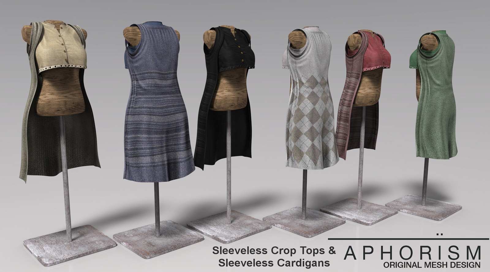 Moving on to my outfit: I’m wearing APHORISM’s latest release for THE SEASONS STORY. It’s such a treat, yet again something I would happily wear in real life! This is a rather lovely longline cardigan and sleeveless crop-top that fits like a dream, as do all of RUCY BYRON’s mesh endeavours. The shape of the longline cardigan is very authentic; sleeveless and loose with the top sitting snugly underneath. You can of course mix and match them or wear them separately with other items, something that I’m sure I’ll be trying over forthcoming blogposts. Aphorism items are always a real joy to wear and it’s a credit to Rucy’s imagination that he comes up with some amazing collections time and time again.