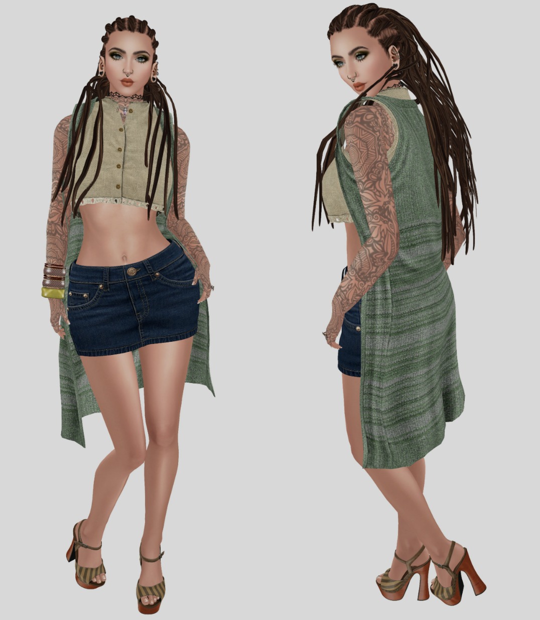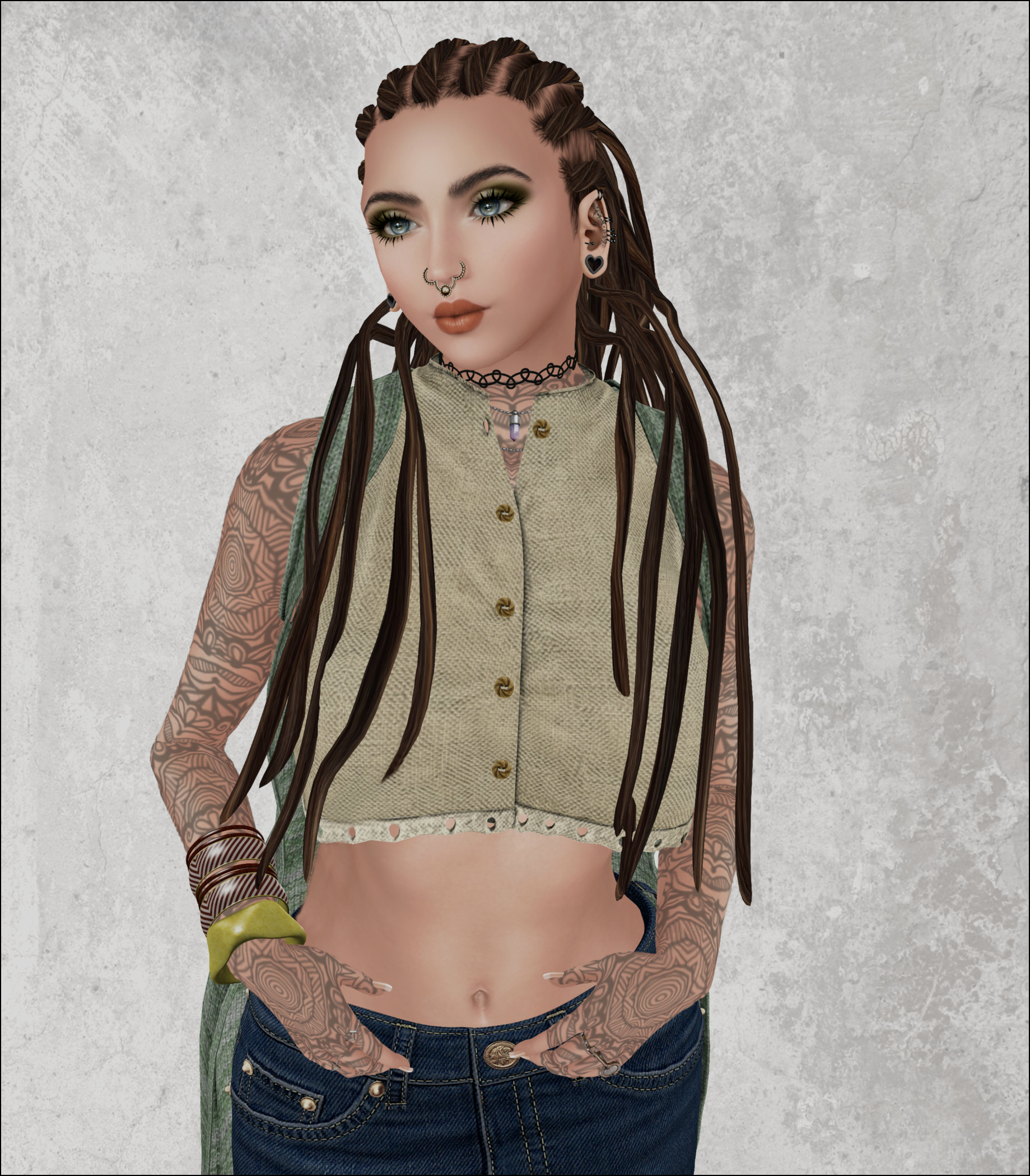 I’ve done very little to this snap other than add a background and fix a dread that was sticking through my torso; I want you to bear that in mind BECAUSE I want you to click on the picture, zoom in and take into account the absolutely awesome textures that are at play in this snap. The two main elements, the skin and the top/cardigan combo are from two of my favourite designers on the grid, SHANTIA SOULSTAR and RUCY BYRON, the names behind the brands ZOUL CREATIONS and APHORISM respectively.