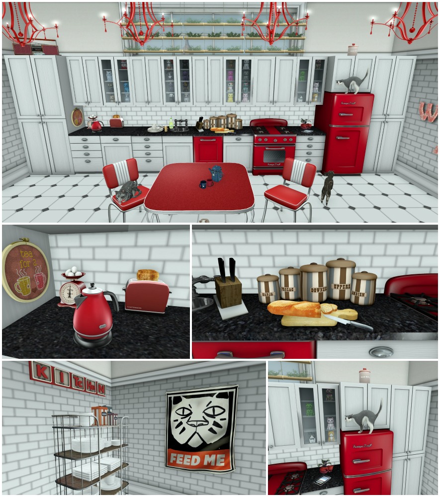 Obviously, my thing is cats both in RL and SL. That’s no different in my skybox either, and as soon as you enter you’re surrounded by cats of every shape and size; some decorative, others who live with me. The kitchen space is no different, in fact, I used the TROMPE LOEIL kitchen cabinets to house my precious SCHADENFREUDE Chibi Cats collection. There are also four FASHIONABLY DEAD cats mooching around in the space, but that’s because I keep my HALF DEER litter tray and food bowls here too.