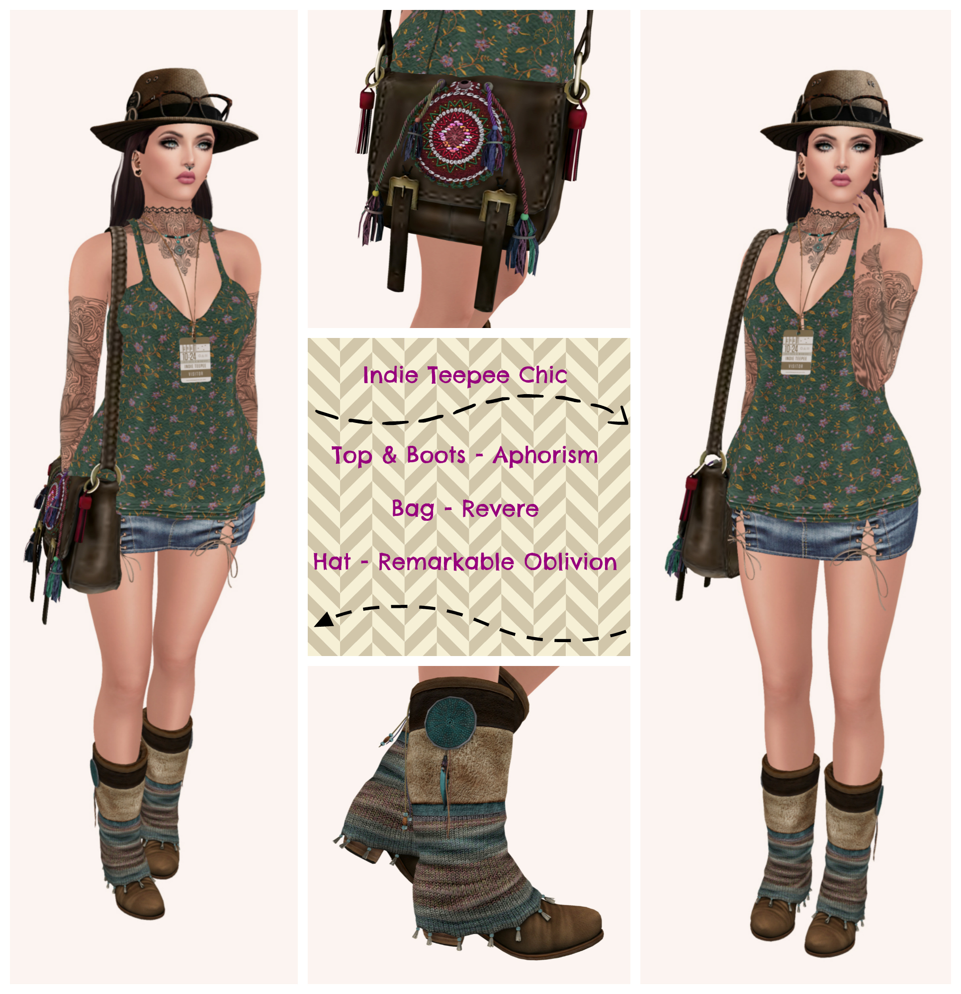 PicMonkey CollageWhat do you wear at an event such as this? Well, festival chic obviously, and you’ll be able to stock up on that at the event shops. Take stacks of Lindens guys, because the shopping is good!   Some of the best content creators in Second Life are participating and you can be assured of some fabulous finds.  I found a fantastic summer top from APHORISM at the event. The ‘Sun-Kissed’ top comes in 5 pattern colours (Yellow, Black, Green, Pink and White) and 5 plain colours (Blue, Crimson, taupe, White and Black) and is quintessential festival wear. I opted for the flowery print in loose cotton which while simple perfectly encapsulates the festival vibe. (I teamed it with my APHORISM ‘Glastonbury’ boots, an old favourite of mine, these boots are the kind of virtual fashion that beg for close attention. Zoom in to catch all the details and you won’t be disappointed!) The boots and top look perfect with an epic INDIE TEEPEE festival-find, the stunning ‘Haight-Ashbury’ leather bag with an embellished pattern from REVERIE that really does need to be seen to be believed. Last but not least you’ll need a hat to give you some relief from the sun in the desert heat, and I found the perfect hat in the shape of a rather glorious fedora by REMARKABLE OBLIVION. Yes, it’s a fedora but no, it doesn’t require tipping, OK? You’ll find a full list of participating shops HERE.indie teepee_007