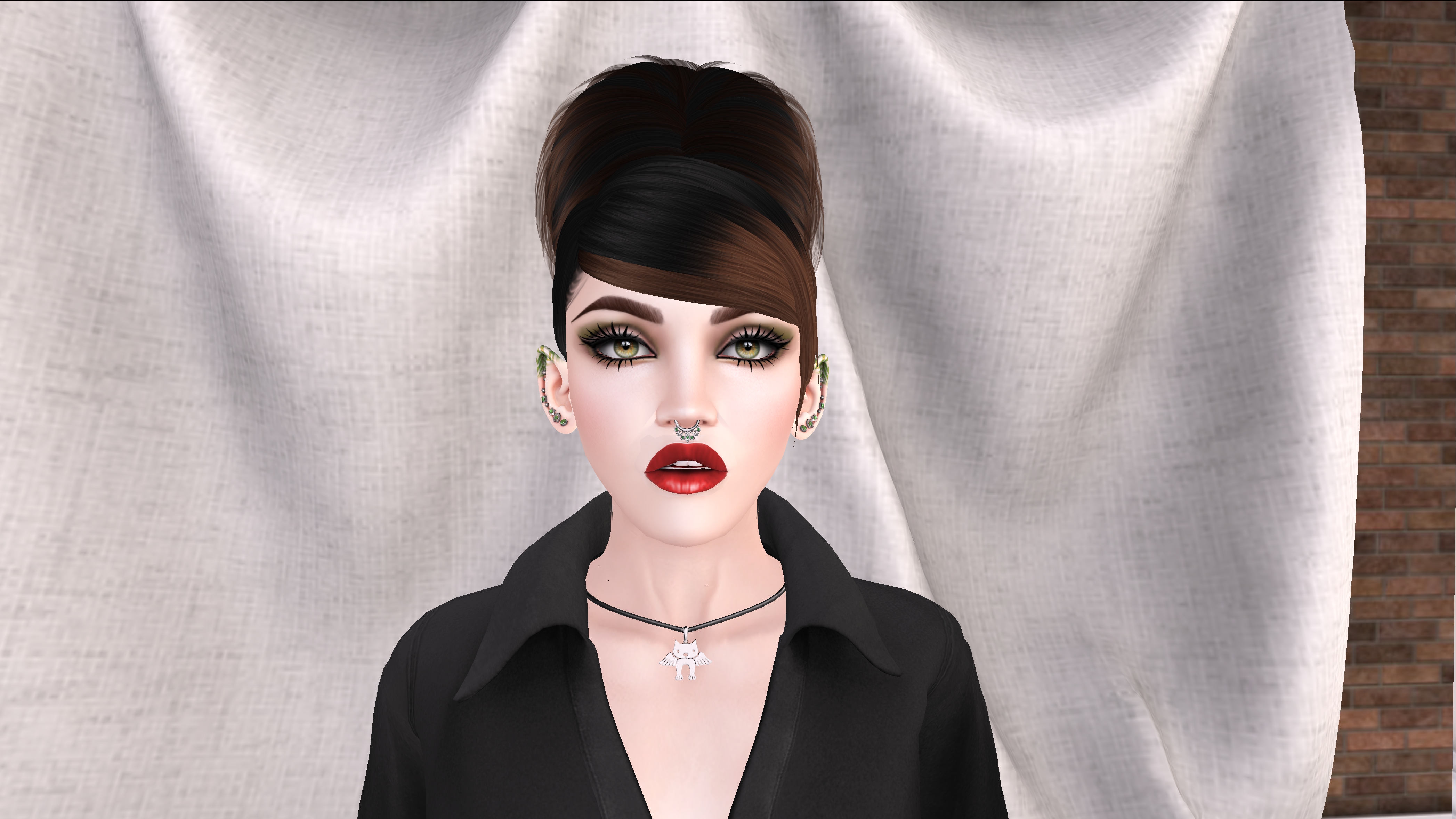 There’s been a huge amount of buzz around this beehive hairstyle because it went  ‘SLviral’ on Flickr and Plurk a few days before event release which  of course drove the shopaholics into a frenzy. It’s not surprising  because it’s  beautifully made and really evokes the inspiration behind the name (which, if you don’t know, is of course Audrey Hepburn).  It’s a nice, weighty style which suggests that it would be heavy on the neck, and has acres of volume on the crown.  The back is neatly finished into what was called a ‘DA’ in the late 50’s/early 60’s.  That stands for ‘Ducks Arse’, and it was a particular favourite of teddy boys who created the style with brylcreme and a fine comb.  (Alex Turner from Arctic Monkeys has been doing similar recently too).   I find Ombres the most versatile of shades for my needs I opted for the pack filled with a selection of them and I’m incredibly pleased with my purchase.  I will have to venture back to the event once it’s calmed down a bit though; there’s a free hairband that can be worn with this style in the booth and I don’t want to miss out on that. (Which would of course make this style perfect wedding hair..let’s not go there, OK?)I’m still wearing the astonishing GLAM AFFAIR ‘Katra’ skin that I picked up during last week’s FIFTY LINDEN FRIDAY.  Like I wrote last week, it really does serve as an exceptional base for make-up layers and now that we have the facility to apply SIXTY wonderful layers of nonsense on our bodies you’d better believe I’m all about the eyeliner and the lipstick and all that jazz.  Fortunately there are some brilliant cosmetic brands at this event, and I’m incredibly impressed by a new-to-me brand, LA BOHEME. The make-ups were heavily discounted. Would they be any good? Well, the evidence speaks for itself; as soon as I put them on I knew I was, to coin a Charlie Sheen phrase, ‘Winning’. They’re excellent.  Totally un-touched picture above peeps, and my make up looks ruddy fantastic doesn’t it?  This shot is of me in my bedroom testing out my hairstyle and make-up layers and as you can see this LA BOHEME  Glamour Eyes ‘Hecate’ eyeshadow is simply nothing less than sublime.  Isn’t it a treat? I bought a few packs and I will enjoy using them in forthcoming posts I think (I’m ALL about the eyeliner, I really am) but I tell you what I really like about this eyeliner in particular; it’s quite sharp. Oftentimes the lines look quite smudged and shading can be a tad off, but this is practically perfect and that really pushes all my kitty-buttons.  Turns out LA BOHEME is a brand that is more than happy to supply amazing make-ups at a fraction of the cost that is usually charged in-world.   In fact, the brand has been around since *gulp* 2004!  I actually took a quick trip over to the main store too for a quick nosey; and I’m inclined to think that the store owner is a bit witchy due to the naming conventions applied to her wares..(touches nose in a knowing fashion).  Needless to say once the event has calmed down a bit I’m heading back to her booth and buying everything in the store, it would be rude not too!